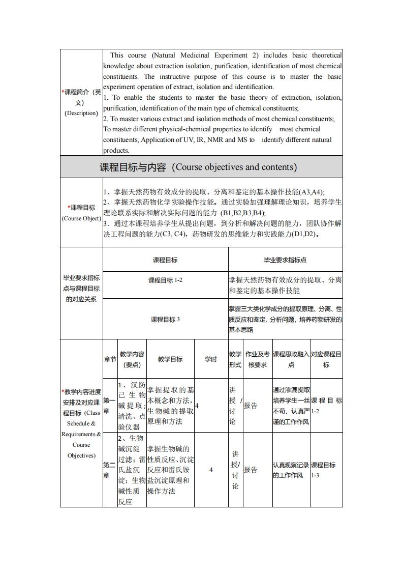 《天然药物实验2》课程教学大纲课程基本信息(Course Information)*学时课程代码*学分PM332(Credit 32(Course Code)】(Credits)Hours)◆课程名称(中文)天然药物实验2(CourseName)(英文)Natural Medicinal Experiment2课程类型必修课(Compulsory Course)(Course Type)授课对像(Target药学专业本科生(Undergraduate student)Audience)授课语言(Language of中文(Chinese)Instruction)*开课院系(School)药学院(School of Pharmacy)有机化学,分析化学,药物结构解析,药用植物学,生药学(OrganicChemistry先修课程后续课程天然药物化学(Natural MedidinalAnalytical Chemistry.Structure(Prerequisite)(post)Chemistry),药物分析AnalysisofDrugsPharmaceuticalBotanyPharmacognosy)课程网址*课程负责人金慧子(Huizi Jin)(Coursettps://oc.situ.edu.cn/courses/24808(Instructor)Webpage)《天然药物实验2》是天然药物化学课程的重要组成部分,是使学生进步理论联系实际,掌握天然药物有效成分的提取、分离和鉴定的基本操作技能,·课程简介(中风固和加深理解课堂上所学知识,培养学生观察、分析和解决问题的能力,养文)成严密科学态度和良好工作作风。(Description)】《天然药物实验2》以实验为主,要求学生掌握一般提取(渗漉法、离子交换法、索氏提取法、回流提取、液液萃取法等)方法。掌握普通柱色谱、低压柱色谱、薄层制备,pH梯度等分离方法。掌握纸色谱、硅胶、氧化铝、聚酰胺、纤维素等色谱分离方法。
