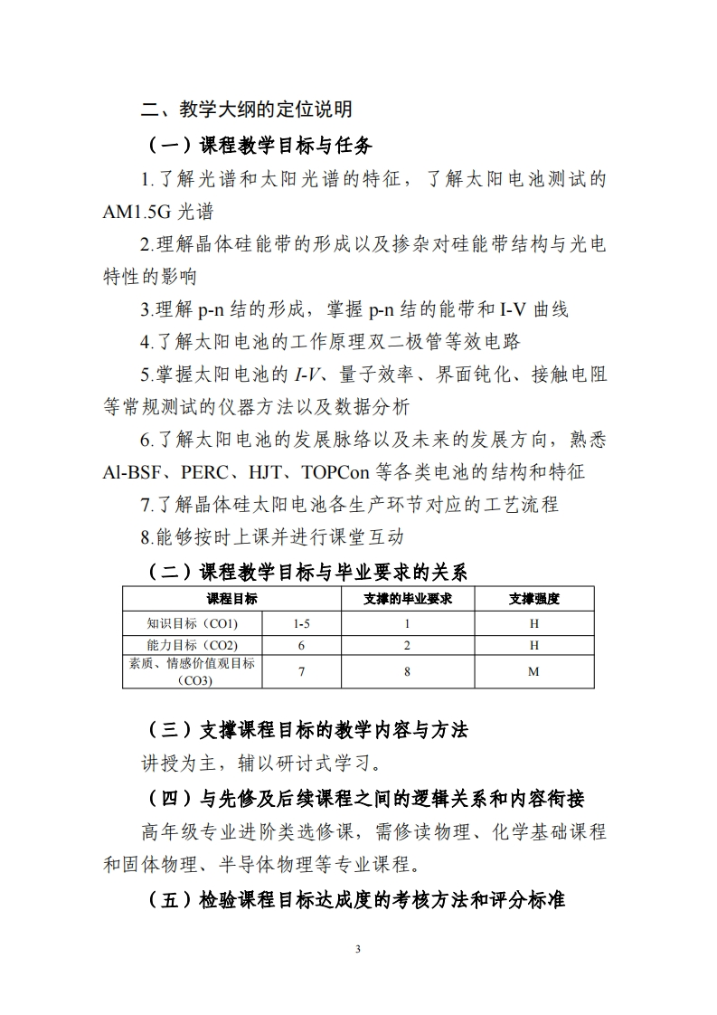《太阳电池物理与器件》课程教学大纲一、课程概况课程名称太阳电池物理与器件课程号107413032课程英文名称Physics and Devices of Solar Cells学时/学分36/2课程性质选修适用专业新能源材料与器件课程负责人刘奇明教学团队王子磊选用散材及参考书目高平奇等,《太阳电池物理与器件》,第一版,中山大学出版社,2022年课程简介:本课程旨在使学生全面掌握太阳电池的工作原理,了解各种太阳电池材料的特性与制备工艺,掌握太阳电池器件的设计方法,并对太阳电池技术的最新进展和应用前景有所了解。课程内容涵盖光伏效应原理、半导体物理基础、p-结理论等太阳电池物理基础,以及太阳电池材料、结构、制备工艺与测试方法等关键知识点。此外,课程还将介绍太阳电池在光伏发电系统中的应用,以及太阳电池技术的最新进展和发展趋势。本课程还将培养学生的创新思维和实践能力,为未来从事新能源、光伏产业等领域的工作打下坚实的基础。课程目标(Course Objectives,CO)知识目标(CO1)了解太阳电池所必需的半导体物理基础、太阳电池的原理、发展历史和发展方向。熟悉太阳电池与器件的基本知识,包括太阳电池的工作原理、材料能力目标(C02)特性及制备工艺。掌握太阳电池常用的测试方法与数据分析,理解太阳电池器件设计的基本原则,能参与相关的科研项目和实践活动。素质、情感价值观目标(CO3)为学生未来从事光伏方向的技术工作、学习后续课程及科研活动打下坚实基础。回PM1讲授法教学24学时67%回PM2研讨式学习12学时33%教学方式(Pedagogical口PM3案例教学学时%口PM4翻转课堂学时%Methods.PM)口PM5混合式教学学时%口M6体验式学习学时%考☑EM1课程作业30%oEM2单元测试%☑EM3课堂辩论10%考核方式必(Evaluation选☑EM4期中考试10%☑EM5期末考试oEM6撰写论文/50%%Methods.EM实验报告考查oEMI课程作业%oEM2单元测试%口EM3课堂辩论%