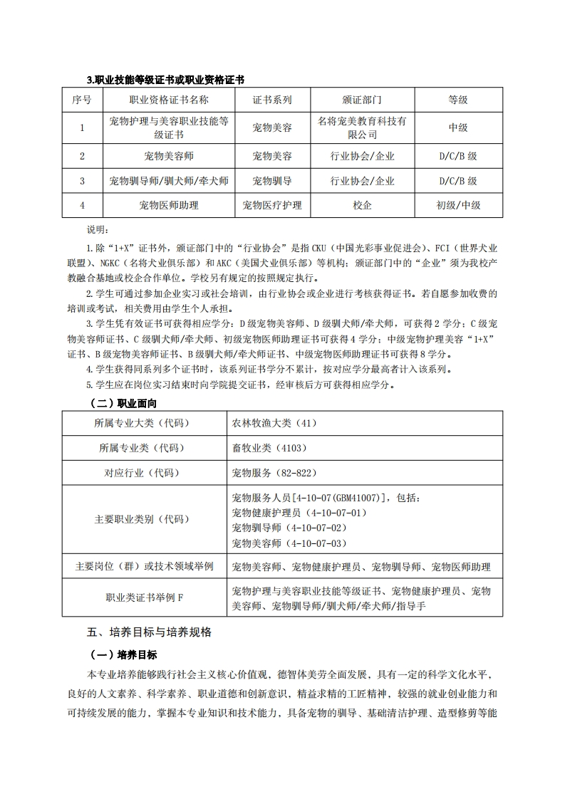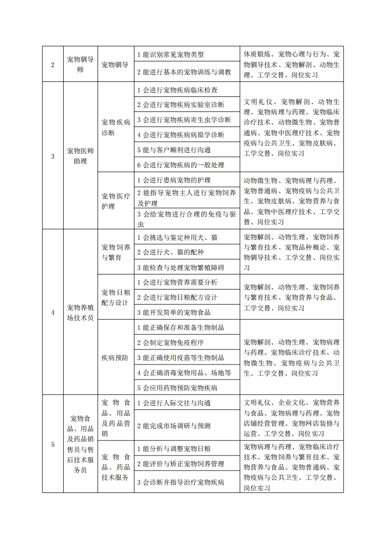 《宠物养护与驯导》专业人才培养方案一、专业名称及代码专业名称:宠物养护与驯导专业代码:410309二、入学要求招生对象:高中(中职)毕业生或具有同等学力者。招生类型:文理兼收。三、修业年限三年。四、职业面向(一)职业能力分析1专业服务面向毕业生主要面向宠物美容护理服务、宠物医疗护理服务、宠物养殖繁殖、宠物驯导、宠物用品开发与营销等机构,从事宠物繁育、宠物饲养、医疗护理、美容护理、宠物用品营销等服务、技术指导或管理工作。适应岗位群是:①宠物美容店的宠物美容及护理;②宠物医院、兽医站、野生动物保护中心等宠物(动物)疾病诊疗服务机构的宠物疾病诊疗与护理;③宠物养殖场的宠物疾病防治和监控,以及宠物繁育、日粮配方设计、宠物饲养与驯养;④宠物用品及药品的营销。(1)初始岗位群初级(D级、C级)宠物美容师:初级驯犬师;初级宠物医师助理;宠物繁育机构技术员。(2)发展岗位群人职3~5年:中级(B级)、高级(A级)宠物美容师:中级、高级驯犬师;中级、高级宠物医师助理(化验师、影像师、麻醉师、化验室主管等):自主创业(开办宠物店、宠物医院/诊所、宠物驯导机构、宠物繁殖场等)。入职6~10年:高级(A级)宠物美容师;高级驯犬师;宠物美容培训师、宠物驯导培训师:宠物医院护士长、行政院长、区域综管:自主创业(开办宠物店、宠物医院/诊所、宠物驯导机构、宠物繁殖场等)。2.职业岗位与职业能力分析典型工作序号工作岗位任务职业能力支撑课程1会给宠物清洁美容宠物洗护基础技能训练、宠物美容基础技术、宠物美容造型技宠物美容宠物美容2能完成较简单的宠物美容造型术、宠物品种概论、宠物心理与店美容师3能识别常见犬、猎品种行为、宠物皮肤病、工学交替、岗位实习