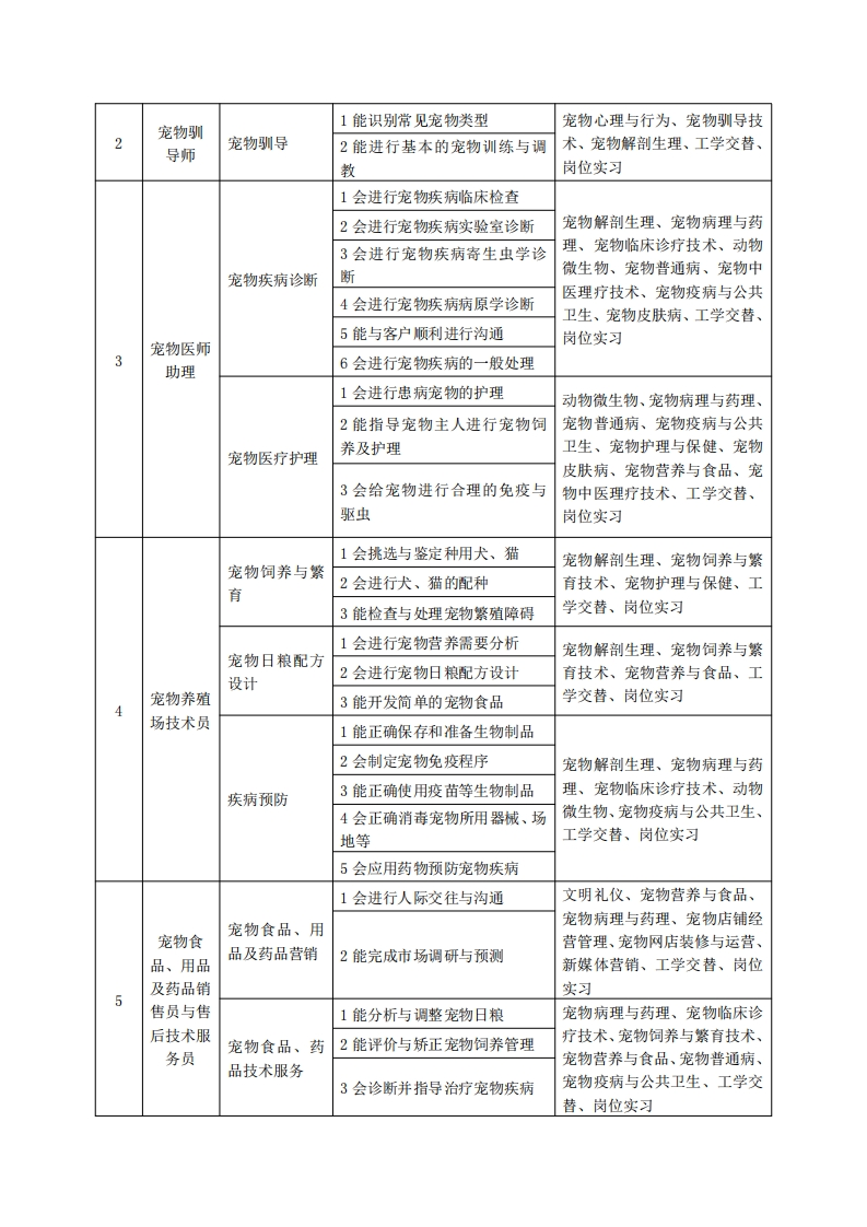 《宠物养护与驯导》专业人才培养方案一、专业名称及代码专业名称:宠物养护与驯导专业代码:410309二、入学要求招生对象:高中(中职)毕业生或具有同等学力者。招生类型:文理兼收。三、修业年限三年。四、职业面向(一)职业能力分析1.专业服务面向毕业生主要面向宠物美容护理服务、宠物医疗护理服务、宠物养殖繁殖、宠物驯导、宠物用品开发与营销等机构,从事宠物繁育、宠物饲养、医疗护理、美容护理、宠物用品营销等服务、技术指导或管理工作。适应岗位群是:①宠物美容店的宠物美容及护理;②宠物医院、兽医站、野生动物保护中心等宠物(动物)疾病诊疗服务机构的宠物疾病诊疗与护理;③宠物养殖场的宠物疾病防治和监控,以及宠物繁育、日粮配方设计、宠物饲养与驯养;④宠物用品及药品的营销。(1)初始岗位群初级(D级、C级)宠物美容师:初级驯犬师:初级宠物医师助理;宠物繁育机构技术员。(2)发展岗位群人职3~5年:中级(B级)、高级(A级)宠物美容师:中级、高级驯犬师:中级、高级宠物医师助理(化验师、影像师、麻醉师、化验室主管等);自主创业(开办宠物店、宠物医院/诊所、宠物驯导机构、宠物繁殖场等)。入职6~10年:高级(A级)宠物美容师;高级驯犬师:宠物美容培训师、宠物驯导培训师:宠物医院护士长、行政院长、区域综管;自主创业(开办宠物店、宠物医院/诊所、宠物驯导机构、宠物繁殖场等)。2.职业岗位与职业能力分析典型工作序号工作岗位任务职业能力支撑课程1会给宠物清洁美容宠物美容基础技术、宠物美容宠物美容造型技术、宠物心理与行为、店美容师宠物美容2能完成较简单的宠物美容造宠物护理与保健、宠物皮肤病,型工学交替、岗位实习