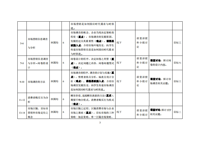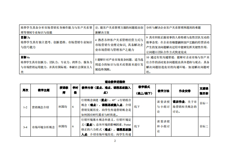 《客户关系管理》教学大纲裸名称:客户关系管理课和类别(必修选修)多选修课程英文名称:总学时周学时学分,48G/3其中实检实减学时,0先修塞:无后续课度支维授课时间:授课地点:提课对津:2019鞭电商开裸学洗:粤合产业科妆学陕任课妆柳姓名称:林口均刚敏线鞭时间、地点与方式:通过课堂面对面答疑,结合通过微信(QQ》、电子邮件、电话等方式答疑,时间和地点依实际情况灵活处理。课是考恢方式:开卷()闭卷()课程论文()其它()报告使用妆材,书名:客户关系管理(第二版)作者:丁建石,出版社:北京大学出版社出版时间:2017年课程简介:本课程介绍了企业如何在经营过程中提高客户满意度、如何通过提高客户忠诚度、如何通过技术手段实现对客户管理的理念、如何对客户进行分类以实现效益最大化、如何对待不同时期不同特征的客户等内容。本课程也加入各种必要的市场营销分析概念与方法、客户服务礼仪、客户异议处理等内容,增加了客户投诉处理等非常实用的内容,并教学了具体操作步骤建议。课程微学目标及对毕业要求州标点的支撑:课程被学目标支撑单业要求指标点毕业要求目标1:】具备从事市场营销领域工作所需的基础和专业知1运用市场营销等相关知识,对企业经掌握市场营销与客户关系管理领域所需的基础知识、应用识,能实务操作解决复杂的市场营销与客户关系管营客户关系管理的问愿具有解决能力能力、创新意识和回际化视野理的问题月标243掌握内外部环境分析的技巧与基础理2能够运用市场营销领域的理论知识与技巧,具备