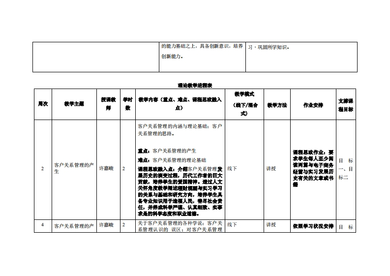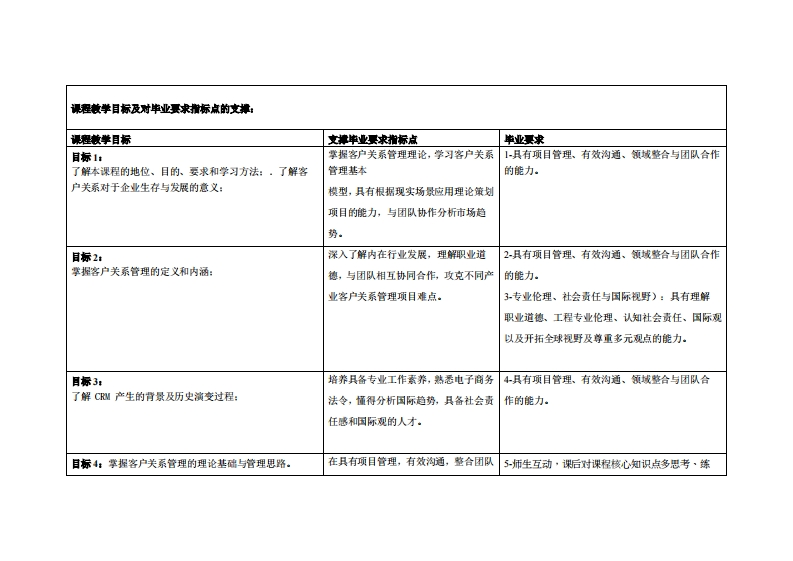 《客户失系管理》教学大纲课程名称:客户尖泰管理课类别(必楼选修):选推课程英文名款:Customer Relationship Management(CRM)总学时周学时学分,3222其中实检实被学时,16先德课程:无后续裸密支撑无授课时间:是期二34节(1-16周)授课地点:6409授课对律:2022级计算机科学与技术跨境电商1班2班开裸学瑰:粤台产业科技学院任课微即姓名淋:许嘉梭刷教授容票时间、地点与方式:课堂或课后,教室或通讯软件,当面或线上答疑课避考核方式:开卷()闭卷()课程论文()其它()非试卷类报告使用教材客户失谦管理(第5版),苏朝浑,清华大学出版社,2021-04,1SBN:9787302578376被学◆考资料:(1)《客户失管迎(第1版)》:作者:李黎红:出版社:清华大学出辰社,北京交通大学出版社:ISN:9787512117631课程情介:过本课程的学习,使学生掌■客户失东管理的瘦论源由、CM毓的构成、CRM东就的实际应用、培养学生在客户失泰管理练统方面的实际应用能力,为将来从事客户失素管瘦工作和研汽、开发、实意CRM兼统兴定空实的基破。