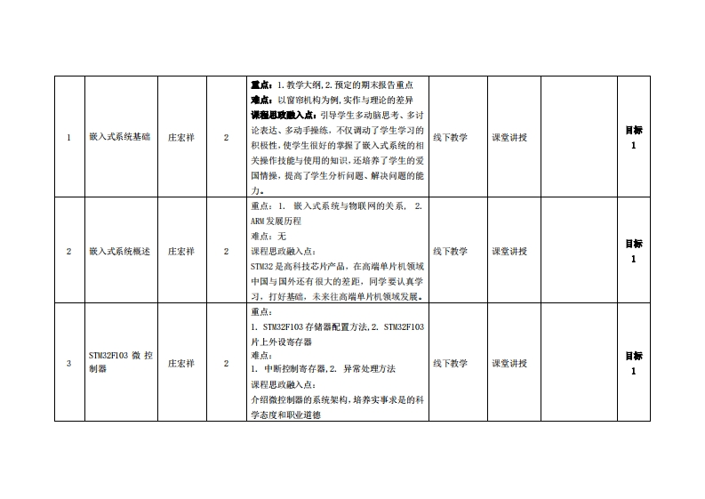 《嵌入式系统》教学大纲课程名称:嵌入式系统课程类别(必修/选修):选修课程英文名称:Enbedded Systems总学时/周学时/学分:32/2/2其中实验/实践学时:16先修课程:《C语言程序设计》、《单片机原理及应用》、《电工电子技术》后续课程支撑:毕业设计授课时间:1-16周,周二3-4节授课地点:莞城3408授课对像:22智能制造1班、2班开课学院:粤台产业科技学院任课教师姓名/职称:庄宏样/教授答疑时间、地点与方式:1.每次课的课前、课间和课后,采用一对一的问答方式:2.每次习题课,采用集中讲解方式。课程考核方式:开卷()闭卷()课程论文()其它(√)(非试卷类报告)使用教材:张勇,A圈Cortex--M3嵌入式开发与实践一基于STM32F1O3,清华大学出版社第二版.参考教材:1.赖树明等编著.嵌入式系统原理与开发课程.电子工业出版社20212.张勇,陈爱国,唐领军.ARM Cortex--M3嵌入式微控制器原理与应用.清华大学出版社,2020.课程简介:本课程《嵌入式系统》是智能制造电子信息工程、通信工程、学等专业的一门综合性很强的课程,硬件上集成了微处理器、存储器、外围电路等结构,软件上包括应用软件、操作系统、开发工具链等。要求在嵌入式系统课程的学习中委融会贯通计算机组成原理、计算机体系结构、接口技术、操作系统等多门课程知识,同时还应掌握多种程序设计方法。该课程主要介绍以A圈系列微处理器为核心的嵌入式系统设计原理,包括硬件设计