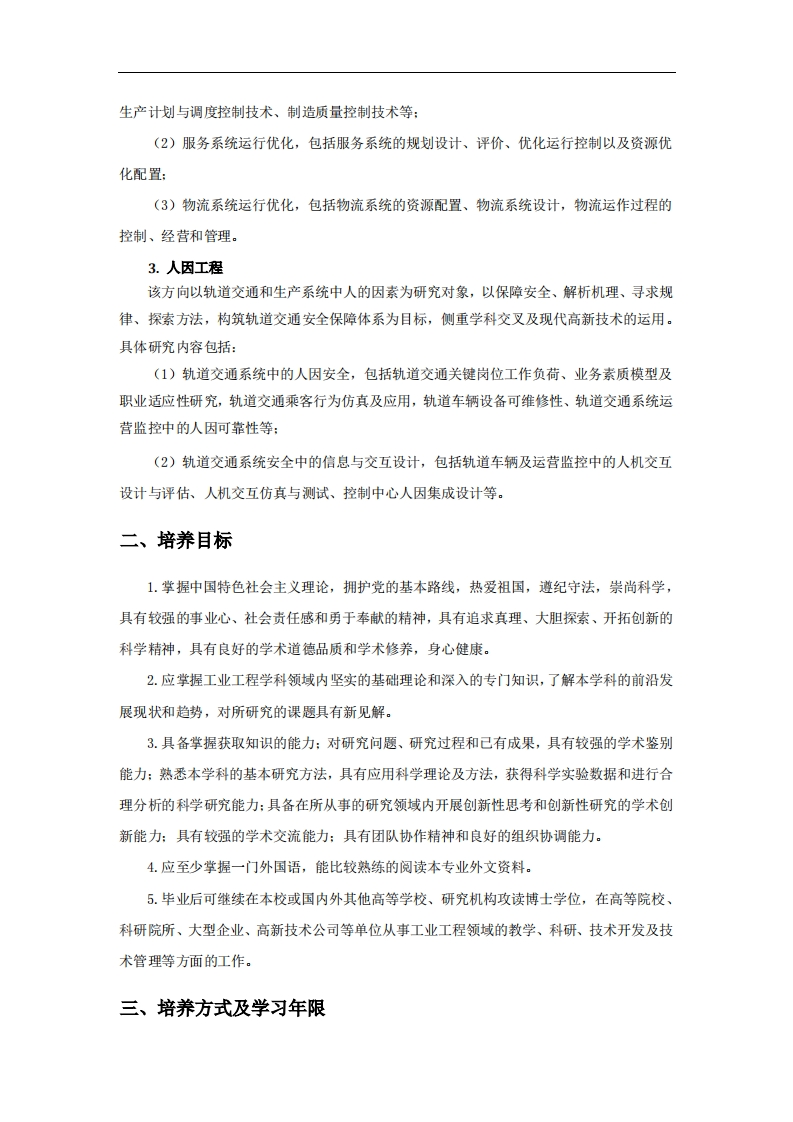 工业工程(学科代码:0802Z1授予工学硕士学位)一、学科专业及研究方向工业工程是对人员、物料、设备、能源和信息所组成的集成系统规划、设计、改进、优化以达到系统的高效率、高质量、低消耗,为人类生产和生活造福的一门学科。它综合运用数学、物理学和社会科学等方面的专门知识和技术,对系统所取得的成果进行说明、预测和评价。北京交通大学工业工程专业隶属于机械与电子控制工程学院,依托“国际化创业型工程与管理复合人才培养模式创新实验区(国家级)”和“轨道交通控制与安全国家重点实验室”,以北京交通大学办学特色为指导,培养拥有工程背景,管理和技术相融合,注重实践、创新的国际化复合型应用人才。目前,该学科拥有首台国内具有自主知识产权的轨道交通人因综合测试仿真平台、现代集成制造系统以及生产和服务系统运行优化和仿真实验室,能全方位地保障人因工程、生产和服务系统运行优化、信息系统集成等领域的教学和科研。主要研究方向及其内容:1.现代生产棋式与系统集成本研究方向针对在网络化生产环境下信息采集存储、分析服务、共享集成等方面的需求,综合运用信息技术、管理学、系统工程、计算机技术、机械工程、自动化技术,从理论、技术、工程应用等不同层面,研究网络环境下企业的生产模式、信息管理、资源共享与系统集成技术。具体研究内容包括:(1)企业信息管理技术,包括物联网环境下企业信息的采集、存储与分析以及信息服务与管理技术,制造过程监测与控制方法和技术等:(2)现代设计和生产模式,包括现代设计模式和方法,网络化环境下的制造模式、方法、技术和应用等。2.制造与服务系统运行优化理论与技术该方向采用运筹学与统计分析技术、系统建模与分析技术、设计与实验等理论方法与技术,从系统的角度优化组织与控制制造和服务系统要素及其配置,达到提高制造和服务系统效率、降低成本、提高质量和柔性等目的。具体研究内容包括:(1)制造系统运行优化,包括生产系统建模与分析及优化技术、生产系统规划技术、