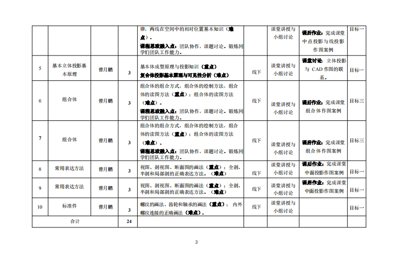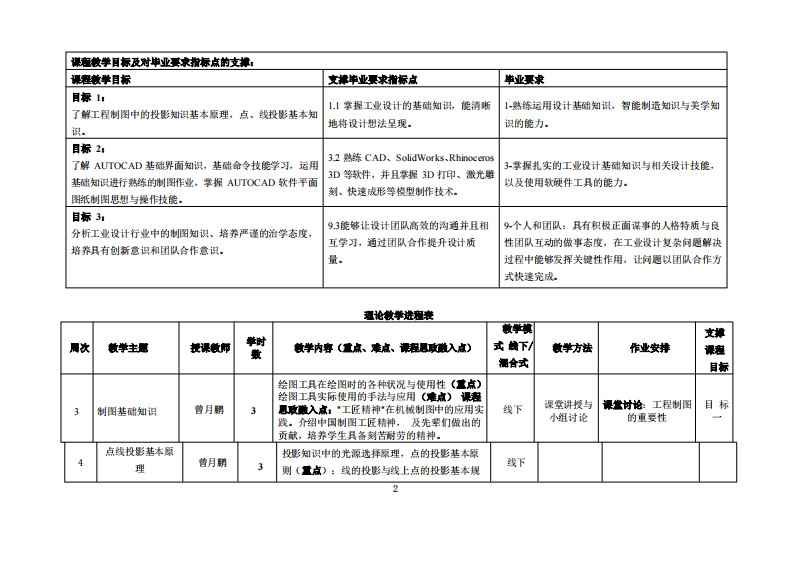 《工程制图》教学大纲裸程名称:工程制图裸程类别(必修/选修):必修课程英文名称:Engineering drawing总学时/周学时/学分:48/3/3其中实险/实液学时:24先课庭:大学计算机基础后候课程支嫌机械设计、计算机辅助工业设计实务投课时间:3-18周■期一6-7节发课地点:实整楼616机房授课对象:2024工业设计1班开课学愧粤台产业科技学院任课款师姓名职称:曹月鹏/副授答展时间、地点与方式:L,课堂:每次上课的课前、课间和课后进行答疑:2。线上:通过电话、邮件、微信线上答凝。课避考核方式:开卷()闭卷()课程论文()其它()使用被材:胡建生主编,《工程制图与Au toCAD》,机械工业出版社课容简介,工程制图是工业设计专业的一门学科基础必修课程,讲授如何了解工程制图并使用CD软件的方法,先通过讲授点线面投影基本原理、基本体投影原理、简单叠加体投影原理及其相关的绘图知识,后将制图概念籍由CD软件让学生学握计算机绘图技能,课程中练习从立体对象转化成平面图纸或从图纸转化成立体对象的概念,工程图纸即能应用在各种产业与制作开发上:此课程主要学习相关的软件为AUTOCAD,为业界最類繁使用的工程图纸软件。本课程软件技能学习是相对重要的部分,台在培养学生的软件应用、图像的空间转化能力,使学生能从软件应用与灵活的构思中学习到能应用于产业的专业方法,从而能理解行业制图要求,通过实际案例的绘制学习熟练学握行业从业技能,在授课过程中做到将创意与实务结合。