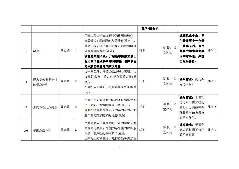 《工程力学》教学大纲裸程名称:工程力苹课程类别(必修选修)事必修课程英文名称:Engineering Mechanics总学时/周学时/学分,48/33其中实险实戒学时:0先售课是:高等数学,大学物理后续课程支撑:机械设计:机械原理授课时间:周二/57节(1-16周)授课地点:莞城6409投课对津:2024智能制造1,2班开课学洗:粤台产业科技学陕任课敏即姓名/职淋:周忠诚/副教授答鞭时间、地点与方式:课间任何时段:课后预钓即可课程考核方式:开卷()闭港(√)课程论文()其它()使用微材:工程力学:静力学与材料力学/单辉祖,谢传锋编.一北京:高等教育出版社,9787040556186,2版,2021.03妆学考资料:1.工程力学/张秉荣编着.4版-机械工业出版社,2011/11川2.工程力学.静力学和材料力学/唐静静,范钦珊编着.-3版,北京:高等教育出版社,2017.2:课程简介:工程力学为工程基础类课程,可使学生在面对工程设计与检验学习过程中建立与力学有关之设计与计算能力基础。本课程教学目的和任务是以简单构件的受力与变形为骨景,了解并雾握材料和结构的受力、变形特性,并进一步零握材料和结构中各种受力(内、外力)与变形(强度、刚度)的基本原理与分析方法·此外,对刚体运动与动力学也进行了重点观念解说与分析·籍由本课程可培养学生的力学思维,使学生能对简单工程问题进行力学分析,建立良好的工程意识和科学意识.