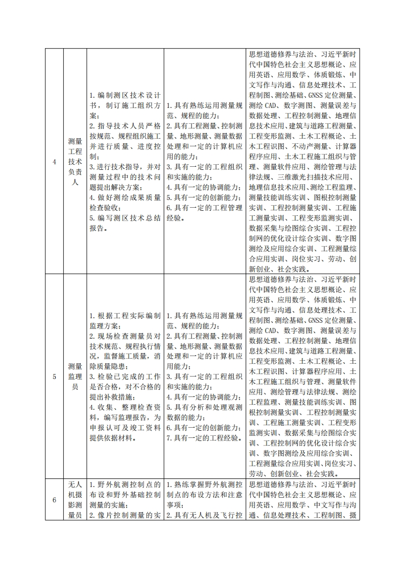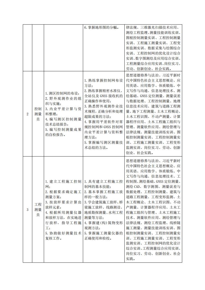 《工程测量技术》专业人才培养方案一、专业名称及代码专业名称:工程测量技术专业代码:420301二、入学要求招生对象:高中(中职)毕业生或具有同等学力者。招生类型:理科。三、修业年限三年。四、职业面向(一)职业能力分析1.专业服务面向本专业毕业生主要面向测绘、水利、交通、国土资源、城市规划和建筑等行业相关企事业单位,从事工程测量的工程技术人员,主要工作包括:(进行工程建设、城市规划和资源开发的勘察设计、施工、竣工、变形监测和运营管理各阶段的测量;(②土地及有关附属物的权属界线、位置、数量和利用现状进行的测绘;(③)为国家基础测绘进行的基本比例尺地形图测绘、国家平面、高程控制网布设及施测。毕业后的就业岗位主要有:地形测量员、控制测量员、工程测量员、测量工程技术负责人、测量监理员、无人机摄影测量员等工作岗位。2.职业岗位与职业能力分析序工作职业能力支撑课程号岗位典型工作任务1.图根控制点的布设:1.熟练掌握图根点的布思想道德修养与法治、习近平新时2.图根控制点的野外设方法:代中国特色社会主义思想概论、应观测和计算:2.熟练运用各类测量仪用英语、应用数学、体质锻炼、中3.采集地形数据,绘制器进行图根点的野外观文写作与沟通、信息处理技术、工地物草图:测和内业坐标计算及资程制图、测绘基础、GNSS定位测量、地形4.坐标数据传输与成料整理方法:测绘CAD、数字测图、测量误差与1测量图格式转换:3.熟练掌握野外地形点数据处理、工程控制测量、地理信员5.内业图形的绘制、编的数据采集方法:息技术应用、建筑与道路工程测量、辑与整饰:4.熟练掌握1-2种内业工程变形监测、土木工程概论、土6.用绘图仪出图:成图软件的使用:木工程识图、不动产测量、计算器7.提交测量成果自检5.理解测量规程并能熟程序应用、土木工程施工组织与管报告。练进行实际运用:理、测量软件应用、测绘管理与法