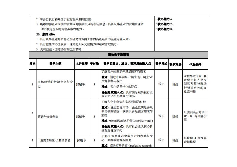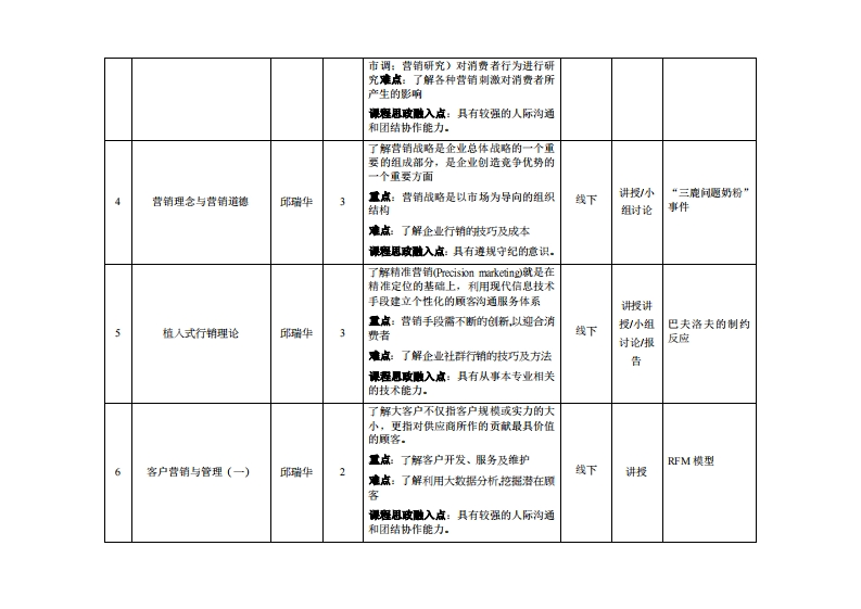 《市场营销》教学大纲课程名称:市场营精课程类别(必修选修):裸程英文名称:arke tir吧总学时/周学时学分:48/33其中实险实线学时:16先排课程:提课时间:提课地点:授课对浪:9枪牛年在融1事(带三雪)开课学院:粤台产业科技学院任课数师姓名职落:年嗜中/清年答展时间、地点与方式:1每次课的课前和课后,采用主题单元教学:请学生事前先预备单元内容相关基本知识点:提高学习多元化·2每次上课,采用TBL·PBL二种方式进行案例分讨论的问答方式进行分析·课程考核方试:开卷()闭卷(/)课程论文()其它(PPT&Paper)使用微村:极简市场营销(第一版);作者:胡超:北京联合出版有限公司出版社.,2020年12月·做学◆考资料,回内外参考文献:消费者心理学销售管理学客户管理及品营销学等补充教材·课程情介:藉由课程了解企业要满足顾客,实现经营目标,不能单只是考虑某一因素和手段·必须从目标市场需求和市场营销环境的特色出发,根据企业的资源和优势,综合运用各种市场营销手段形成统一的,配套的市场营销战略·使之发挥整体效果,争求最佳效果·通过探究客户决策根源·学习市场营销基础知识·课程妆学目标本课程与学生核心能力培养之间的关联一、知识目标:(授课对律为理工科专业学生的课程填1掌握市场营销工作的量化指标与结果追蝴:进而充分认识营销管理在现代企业经营可此烂)管理中的重要作用,培养学生牢固树立市场观念。口核心能力1.2.熟悉消费者心理及在企业的营销过程中能够根据市场环境和企业自身条件进行营口核心能力2销决策,并能对企业的营销工作进行组织与管理·口获心能力3.二、能力目标:口核心能力41.熟练握分析营销市场环境和顾客购买行为的动机进而提升销售能力·口核心能力5