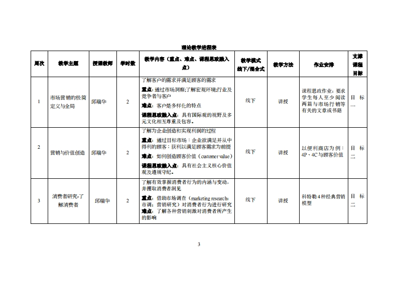 《市场营销》教学大纲课斑名称:市场营州课和类别(必修选修),选修课程英文名称:Marketi吧总学时周学时学分,322/2其中实险实玻学时:8先继课是:管理学相快课泡后续课度支嫌发课时间:期三(56节):■期四(34节)授课地点:实312提课对津:2021经济与金融1-2班开裸学陕:粤台产业科技学洗任课放甲姓名琳:邱瑞华讲师答票时间、地点与方式:课堂课后针对课程有问■曹可提出讨论地点:表速及课后实2卫办公室方式:面时回球微仙交流课程考楼方式:开卷()闭卷()课程论文()其它(报告及PPT限示)使用微村,极简市场营销(第一版);作者:胡超;北京联合出版有限公司出版社,2020年2月。妆学事考资料:国内外参考文献,消费者心理学销售管理学客户管理及品牌营销学等补充教材。课程情介:藉由程了解企业要满足顶客,实现经营目标,不能单只是考某一因素和手段·必须从目标市场需求和市场营销环境的特色出发·根据企业的资源和优势,综合运用各种市场营销手段形成统一的·配套的市场营销战略,使之发挥企业整体表现·通过探究客户决策根源,学习市场营销基础知识·课程放学目标及对毕业要求指标点的支排:一、知识目标:1掌握市场营销工作的量化指标与结果追纵:进而充分认识营销管理在现代企业经营管理中的重要作用,培养学生牢固树立市场观念。2.熟悉消费者心理及在企业的营销过程中能够根据市场环境和企业自身条件进行营销决策,并能对企业的营销工作进行组织与管理。二、能力目标: