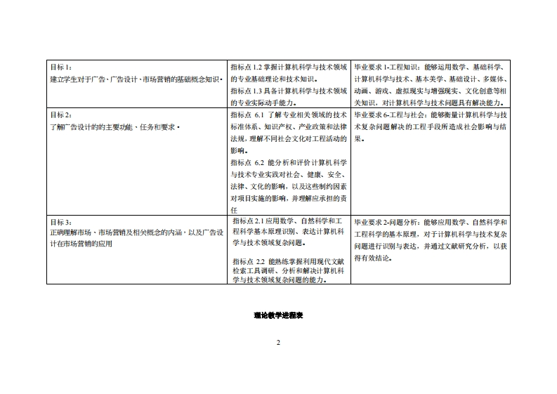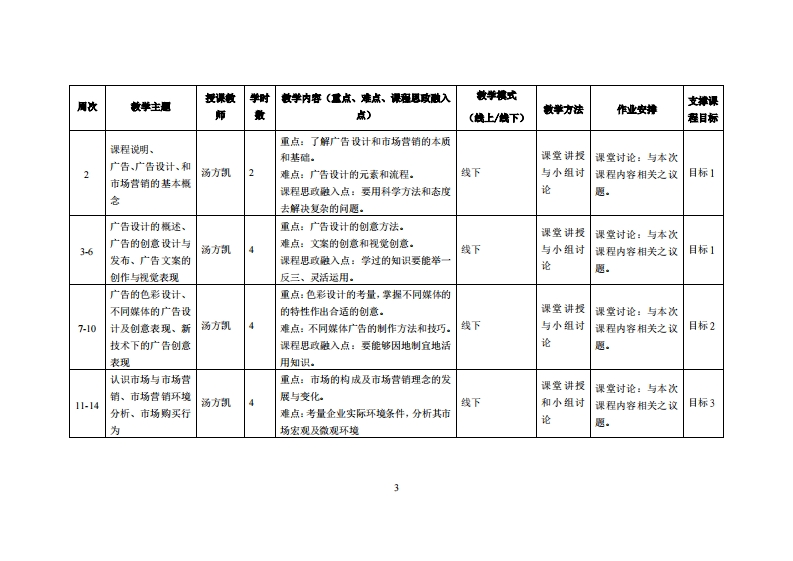 《广告设计与市场营销》教学大纲课避名称,广告设计与市场营辅课和类别(必修选修):选修课程英文名称:Advertising Design and Marketing总学时周学时学分,3222其中实检实液学时,16先继课塞:后续课程支推授课时间:2至17周星期一5-6节授课地点:实217课对津:2021级计技设计1班开裸学陕:粤台产业科技学院任课微师姓名淋:汤方凯副教授答票时间、地点与方式:实验楼3071每次课的课前、课间和课后,采用一对一的问答方式:2每次习题课,采用集中讲解方式。狸拔方式:开卷()闭卷()课程论文()其它()使用微材:任莉(2017)广告设计与创意表现·人民邮电出版社课程简介:本课程将协助学生对广告设计制作有全面的认识和了解,藉由通过由浅入深的创意训练·使学生的了解广告设计的基本流程与方法·此外·也捋协助学生了解市场·市场营销及相关概念的内涵,掌提市场营销观念的演变过程和各种观念的合义要点,以及广告在市场营销上扮演的向色和作用·课程放学目标及对毕业要求指标点的文排:裸妆学目标支撑毕业要求湘标点单业要求