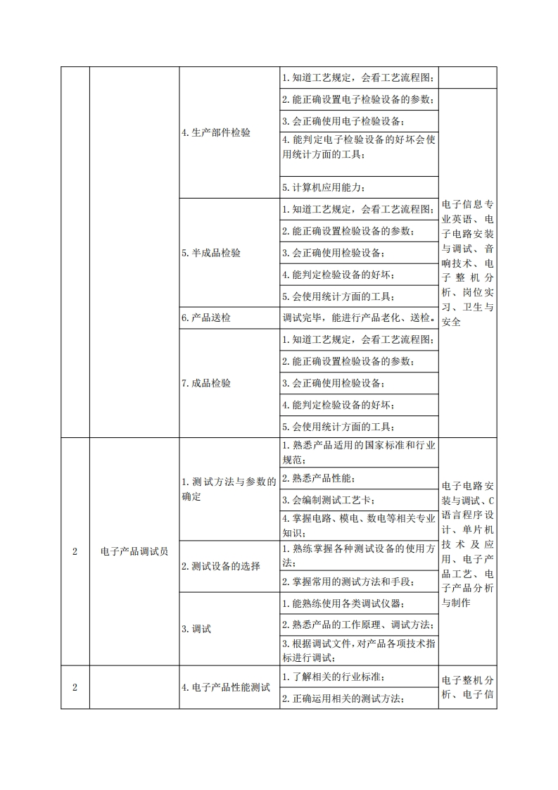 《应用电子技术》专业人才培养方案一、专业名称及代码专业名称:应用电子技术专业代码:510103二、入学要求招生对象:高中(中职)毕业生或具有同等学力者。招生类型:文理兼收。三、修业年限三年四、职业面向(一)职业能力分析1.专业服务面向本专业学生主要面向现代电子信息类的智能硬件开发、专用设备制造业,计算机、通信和其他电子设备制造行业电子工程技术人员、电子设备组装调试、电子工程技术应用等岗位(群),在现代电子产品研发和生产单位的技术、生产、设计、销售、管理、售后等部门,从事产品开发、生产管理、设备维护、电子工艺与质量管理、技术支持、工程施工、产品销售及售后服务等工作。2.职业岗位与职业能力分析序号工作岗位典型工作任务职业能力支撑课程1.熟悉元器件的性能:2.会对常用元器件检验:1.来料检验3.会正确使用检验工具:4.团队协作:信息处理技5.计算机应用能力:术、电路基础、电子产品1.能对物料进行精确核算:1检验员模拟电子技2.原材料分类发放2.熟悉元器件型号,能对领出物料型术、数字电号进行核对、确认:子技术、电3.会元器件分类、并妥善保存:子产品工艺1.知道生产工艺流程:3.工艺文件组装产品2.能熟练使用各类工具:3.能根据操作指导书要求进行操作组装完毕,能进行自检、清洗: