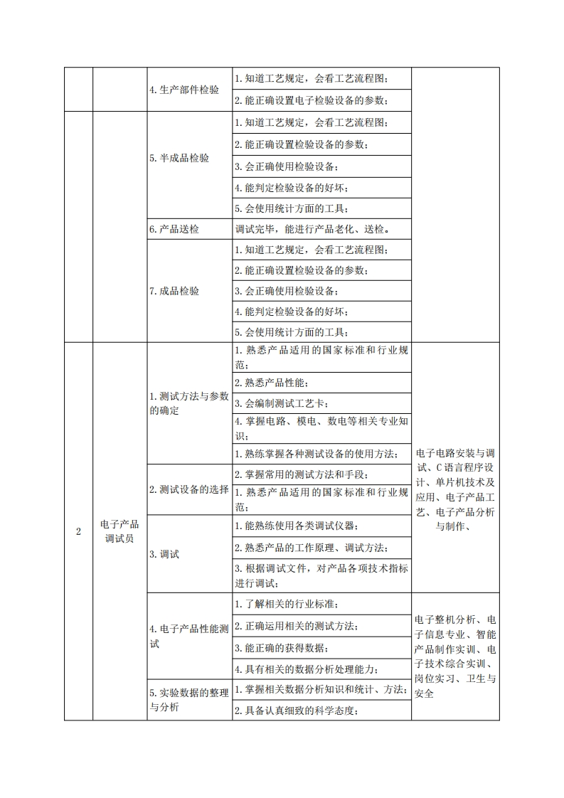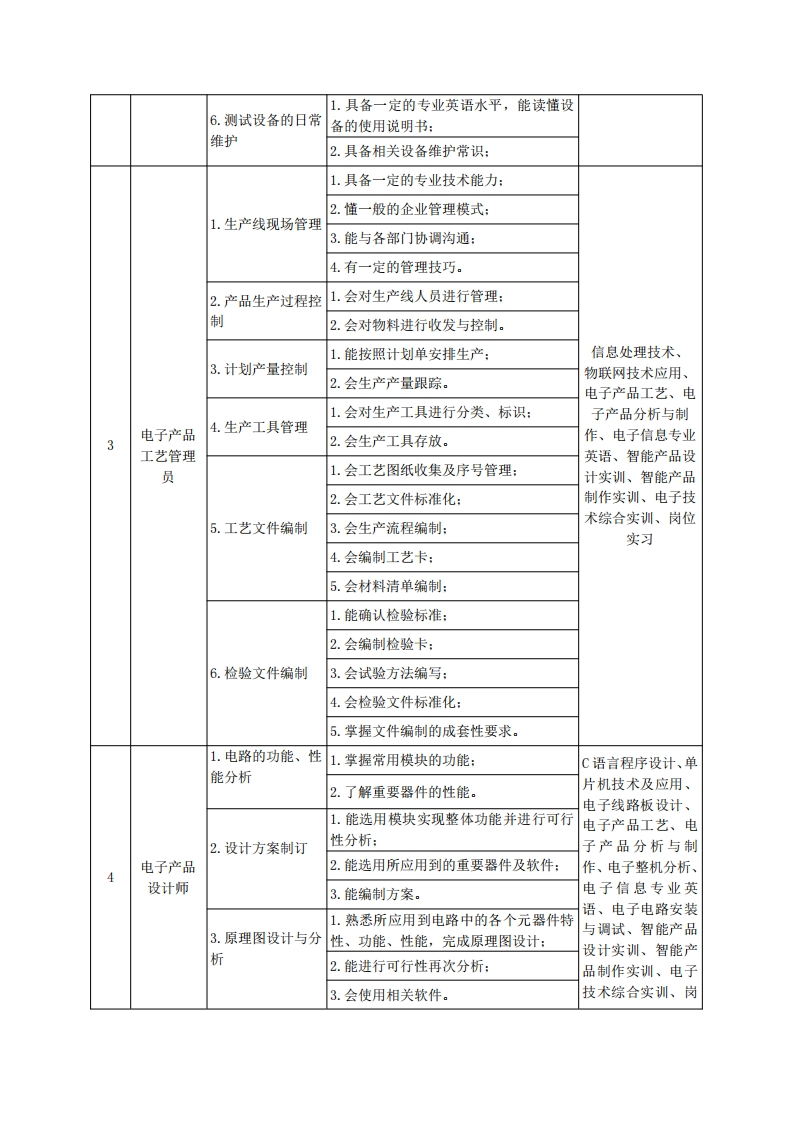 《应用电子技术》专业人才培养方案一、专业名称及代码专业名称:应用电子技术专业代码:510103二、入学要求招生对象:高中(中职)毕业生或具有同等学力者。招生类型:文理兼收。三、修业年限三年。四、职业面向(一)职业能力分析1.专业服务面向本专业学生主要面向现代电子信息类的智能硬件开发、专用设备制造业,计算机、通信和其他电子设备制造行业电子工程技术人员、电子设备组装调试、电子工程技术应用等岗位(群),在现代电子产品研发和生产单位的技术、生产、设计、销售、管理、售后等部门,从事产品开发、生产管理、设备维护、电子工艺与质量管理、技术支持、工程施工、产品销售及售后服务等工作。2.职业岗位与职业能力分析序号工作岗位典型工作任务职业能力支撑课程1.熟悉元器件的性能:2.会对常用元器件检验:1.来料检验3.会正确使用检验工具:信息处理技术、电4.团队协作:路基础、模拟电子技术、数字电子技5.计算机应用能力:术、电子产品工艺电子产品1.能对物料进行精确核算:电子信息专业英检验员2.熟悉元器件型号,能对领出物料型号语、电子电路安装2.原材料分类发放进行核对、确认:与调试、音响技术、3.会元器件分类、并妥善保存:电子整机分析、岗位实习、劳动、卫1.知道生产工艺流程:生与安全3.工艺文件组装产2.能熟练使用各类工具:品3.能根据操作指导书要求进行操作,组装完毕能进行自检: