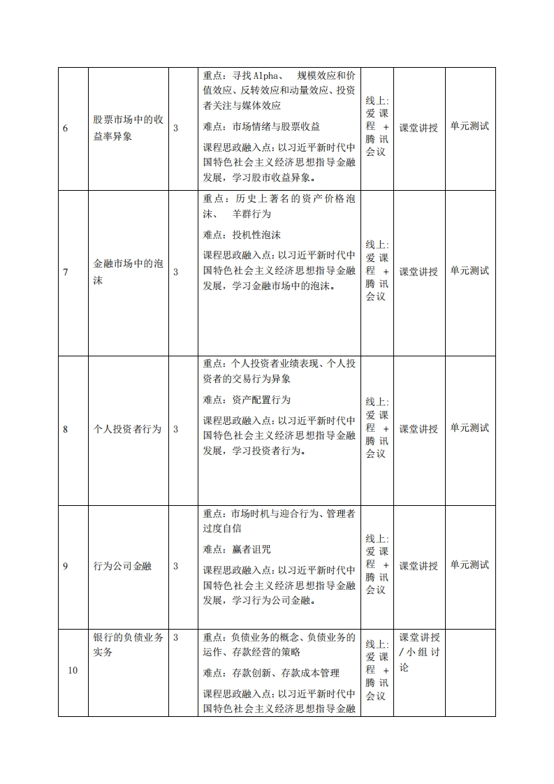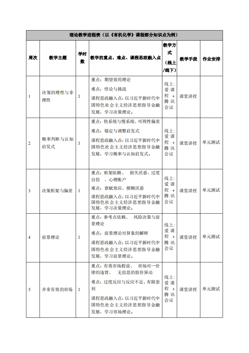 《应用金融2》教学大纲课程名称:应用金融2课程类别(必修/选修):专业必修课程英文名称:Applied finance2总学时周学时学分:48/3/3其中实验/实践学时:18先修课程:徽观经济学、宏观经济学授课时间:周三/1-3节授课地点:实313授课对象:2019级经济与金融专业开课学院:粤台产业科技学院经济与金融系任课教师姓名职称:谢松禄/副散授答疑时间、地点与方式:周二,周三全天/实验楼203办公室/面授与讨论课程考核方式:开卷()闭卷()课程论文()其它(V)使用数材:《风险管理与金融机构》,第4版,(加)约翰赫尔,王勇译,机械工业出版社,2018年。ISBN9787111593362敦学参考资料:1.Mutual Funds:Portfolio Structures,Analysis,Management,and Stewardship;John A.Haslem;Publisher:Wiley;20092.Mishkin and Eakins (2015)Financial Markets and Institutions (GE),8th Edition3.《Risk Management and Financial Institutions》,第四版,John C.Hull,约翰威立商务服务(北京)有限公司Wi1ey,2014年。2.《风险管理》,王周伟,机械工业出版社,2017年。课程简介:本课程教学,以习近平中共中央总书记、国家主席、中央军委主席习近平总书记新时代中国特色社会主义经济思想指导金融发展为核心,培养学生金融机构从业人员专业能力,课程介绍行为金融学,行为金融学是金融学、心理学、社会学等学科相交叉的应用学科,是现代金融学应用的重要基础。课程透过实践课程,了解证券业、银行业、私募、基金管理等金融机构公司的实际营运,装备学生需具备的专业知识,使学生将来能胜任这些金融机构的工作。证券业包含证券市场交易机制、有价证券募集与发行、集中市场、债券、市场投资分析等。银行业包含银行的负债业务、银行的资产业务、银行的表外业务、银行的资产负债管理、银行的营销管理、银行的风险管理、银行经营管理绩效评价。课程教学目标本课程与学生核心能力培养1.培养学生具备专门的投资管理知识(理解)。之间的关联授课对象为理工2.培养顶尖的金融风险控管人员以符合产业界之需求(综合)。科专业学生的课程填写此3.培养学生应用风吟管理于公司与产业界的能力及专业态度(综合)栏):口核心能力1.口核心能力2.口核心能力3.口核心能力4.口核心能力5口核心能力6.口核心能力7.口核心能力8.