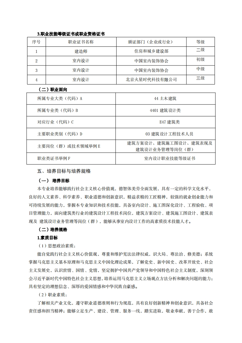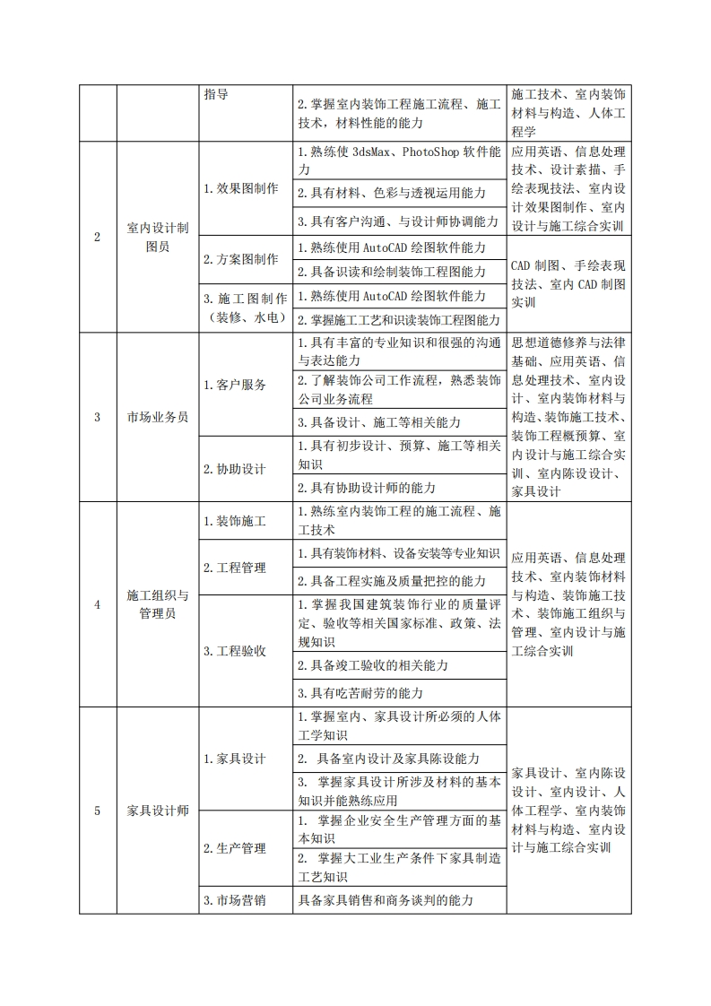 《建筑室内设计》专业人才培养方案一、专业名称及代码专业名称:建筑室内设计专业代码:440106二、入学要求招生对象:高中(中职)毕业生或具有同等学力者招生类型:文理兼收三、修业年限三年。四、职业面向(一)职业能力分析1.专业服务面向本专业学生主要面向室内设计公司、装饰工程公司、展览展示公司、广告策划公司或房地产领域的设计部门、工程部门、市场部门,担任设计师、制图员、工程预算员、市场经理、工程经理等岗位,工作性质包含设计、制图、预算、验收、管理等方面。2.职业岗位与职业能力分析序号工作岗位典型工作任务职业能力支撑课程1.具有较强的沟通交际能力思想道德修养与法律基础、应用英语、信息处理技术、室内设1.业务接待与2.具有完备的专业知识结构和宣传能计、室内装饰材料与交流力构造、设计概论、室内陈设设计、室内设计与施工综合实训1.具有生活方式设计能力室内设计师2.具有艺术效果设计能力设计构成、室内陈设设计、室内设计、人2.方案设计与3.具有整体项目和部分项目设计能力体工程学、手绘表现表现4.具有手绘表现能力技法、CAD制图、室内设计效果图制作、5.具有吃苦耐劳的团结合作意识家具设计6.具有分析问题解决问题的能力3.施工技术与1.具备阅读和绘制装饰施工图能力CAD制图、室内装饰