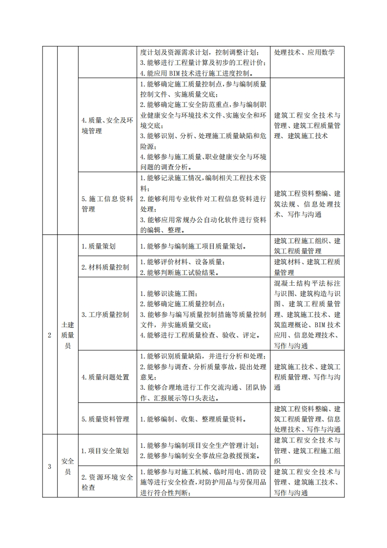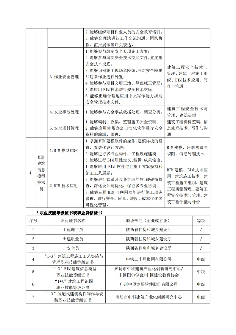《建筑工程技术》专业人才培养方案一、专业名称及代码专业名称:建筑工程技术专业代码:440301二、入学要求招生对象:高中(中职)毕业生或具有同等学力者。招生类型:理科。三、修业年限三年。四、职业面向(一)职业能力分析1.专业服务面向毕业生面向建筑施工企业、建筑监理企业、建筑设计单位、建筑工程管理单位等,在土建施工员、土建质量员、安全员、BM建筑信息模型技术员等岗位,从事施工组织策划、施工技术管理、施工进度控制、施工成本控制、质量安全环境管理、施工信息化管理等工作。2职业岗位与职业能力分析序工作号典型工作任务职业能力支撑课程岗位建筑工程施工组织、建1.能够参与编制施工组织设计和专项施工筑施工技术、建筑工程1.施工组织策划方案:安全技术与管理、建筑2.能够参与制定项目管理制度。工程质量管理、装配式混凝土结构工程施工1.能够识读施工图和设计、施工等文件:建筑工程制图、建筑2.能够编写技术交底文件,并实施技术交CAD、混凝土结构平法土建底:标注与识图、建筑构造1施工3.能够正确使用测量仪器,进行施工测量:与识图、建筑施工技员2.施工技术管理4.能应用BIM技术进行施工技术交底:术、建筑工程测量、装5.能够合理地进行工作交流沟通、团队协配式混凝土结构工程作、汇报展示等口头表达:施工、建筑设备、BIM6.能够正确合理地应用中文写作能力撰写技术应用、信息处理技施工管理、汇报展示、评价总结等文件。术、写作与沟通3.施工进度及成1.能够正确划分施工区段,合理确定施工顺建筑工程施工组织、建序:筑工程计量与计价、招本控制2.能够进行资源平衡计算,参与编制施工进投标与合同管理、信息