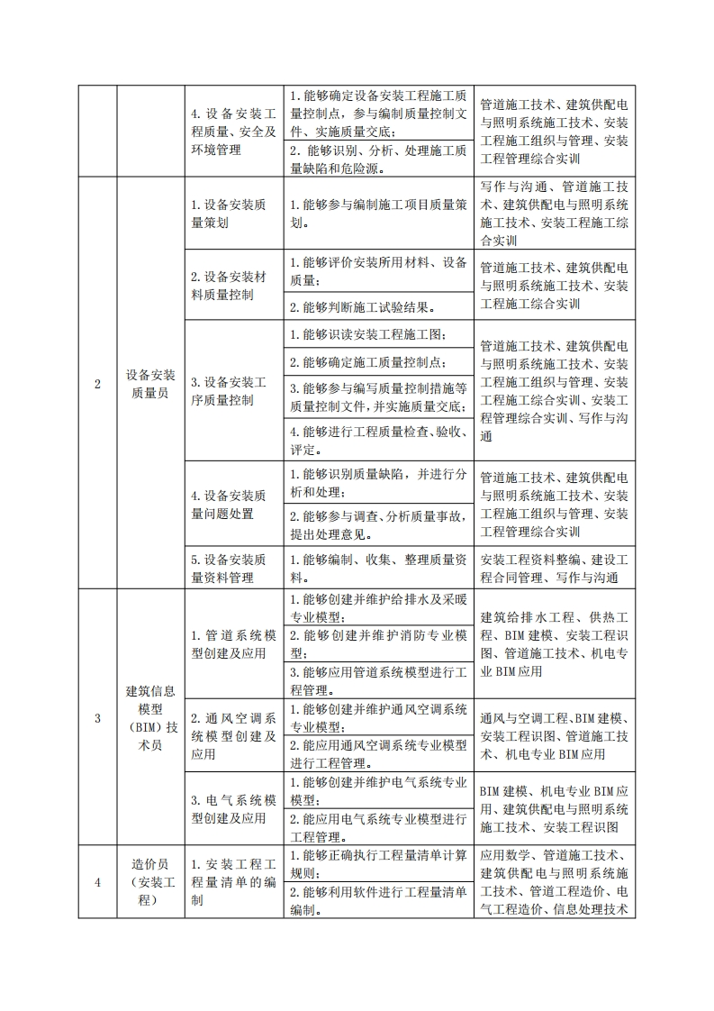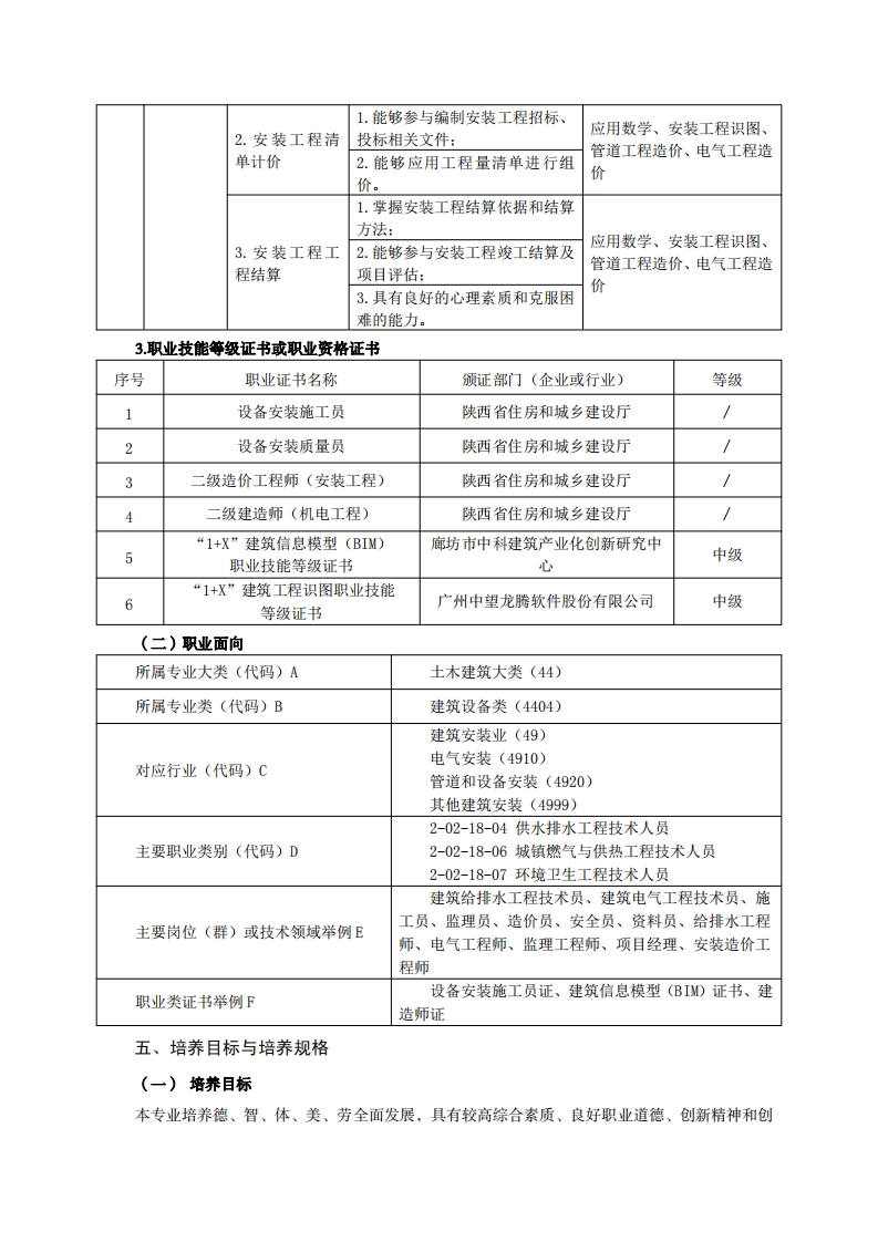 《建筑设备工程技术》专业人才培养方案一、专业名称及代码专业名称:建筑设备工程技术专业代码:440401二、入学要求招生对象:高中(中职)毕业生。招生类型:文理兼收。三、修业年限三年。四、职业面向(一)职业能力分析1.专业服务面向毕业生主要面向建筑设备安装工程施工、工程建设管理、工程监理以及其他与给水排水、建筑电气、采暖通风与空调的相关企事业单位,主要从事建筑给水排水、供热通风与空调、建筑电气工程的施工组织策划、施工作业计划编制及落实、施工质量和安全控制、施工信息资料管理、工程造价及中小型建筑设备系统设计等工作。2.职业岗位与职业能力分析序号工作岗位典型工作任务职业能力支撑课程1.能够参与编制设备安装工程施写作与沟通、建筑构造与识工组织设计和专项施工方案:图、管道施工技术、建筑供1.设备安装工2.具有团队精神、协作精神及集配电与照明系统施工技术、程施工组织策划体意识,具有良好职业道德:通风与空调工程、安装工程3.具有较强的口头与书面表达能识图、建筑工程测量、建设力、人际沟通能力。工程合同管理1.能够识读设备安装工程施工图管道施工技术、建筑供配电和其他工程设计、施工等文件:与照明系统施工技术、供热设备安装2.设备安装工2.能够编写技术交底文件、并实工程、建筑给排水工程、楼施工员程施工技术管施技术交底:宇智能化技术、通风空调工理程、安装工程识图、建筑构3.具有良好的心理素质和克服困造与识图、安装工程施工综难的能力。合实训1.能够正确划分设备安装工程施安装工程施工组织与管理、3.设备安装工工区段,合理确定施工顺序:程施工进度及管道工程造价、电气工程造成本控制2.能够进行设备安装工程的工程价、安装工程管理综合实量计算及初步的工程计价。训、应用数学