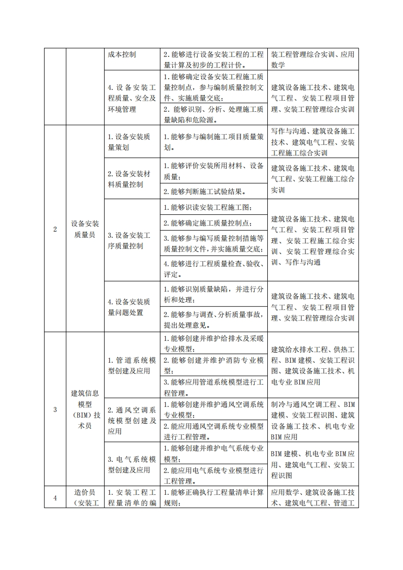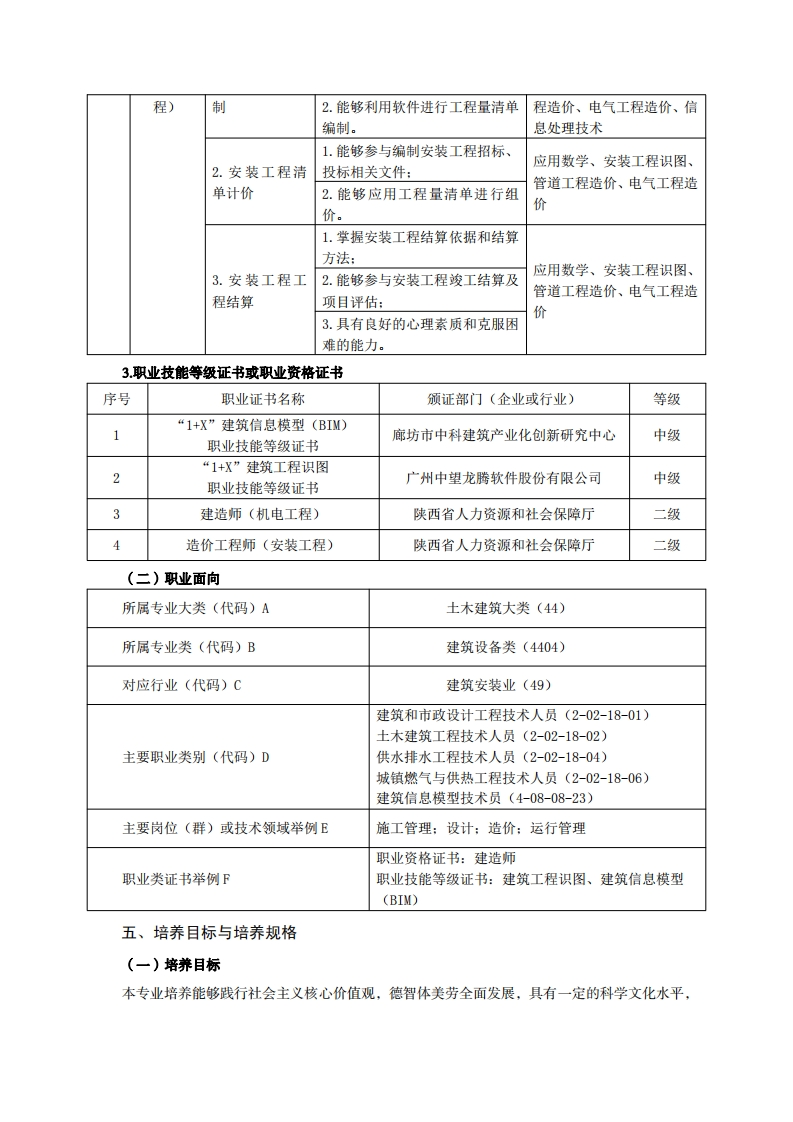 《建筑设备工程技术》专业人才培养方案一、专业名称及代码专业名称:建筑设备工程技术专业代码:440401二、入学要求招生对象:高中(中职)毕业生或具有同等学力者。招生类型:文理兼收。三、修业年限三年。四、职业面向(一)职业能力分析1.专业服务面向毕业生主要面向建筑设备安装工程施工、工程建设管理、工程监理以及其他与给水排水、建筑电气、采暖通风与空调的相关企事业单位,主要从事建筑给水排水、供热通风与空调、建筑电气工程的施工组织策划、施工作业计划编制及落实、施工质量和安全控制、施工信息资料管理、工程造价及中小型建筑设备系统设计等工作。2职业岗位与职业能力分析序号工作岗位典型工作任务职业能力支撑课程1.能够参与编制设备安装工程施工组织设计和专项施工方案:写作与沟通、建筑构造与识1.设备安装工图、建筑设备施工技术、建程施工组织策2.具有团队精神、协作精神及集筑电气工程、制冷与通风空体意识,具有良好职业道德:划调工程、安装工程识图、建3.具有较强的口头与书面表达能筑工程测量力、人际沟通能力。1.能够识读设备安装工程施工图建筑设备施工技术、建筑电设备安装施工员和其他工程设计、施工等文件:气工程、供热工程、建筑给2.设备安装工2.能够编写技术交底文件、并实水排水工程、楼宇智能化技程施工技术管施技术交底:术、制冷与通风空调工程、理安装工程识图、建筑构造与3.具有良好的心理素质和克服困识图、安装工程施工综合实难的能力。训3.设备安装工1.能够正确划分设备安装工程施安装工程项目管理、管道工程施工进度及工区段,合理确定施工顺序:程造价、电气工程造价、安