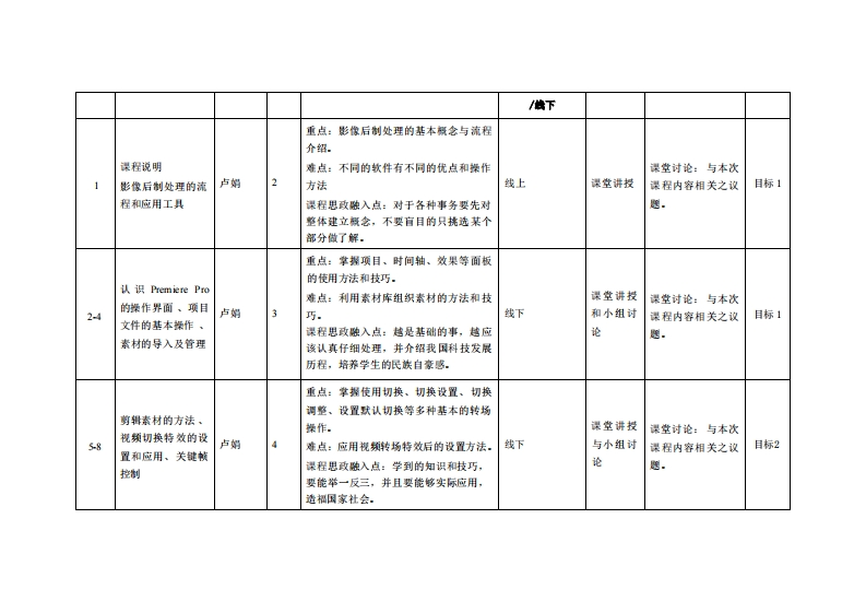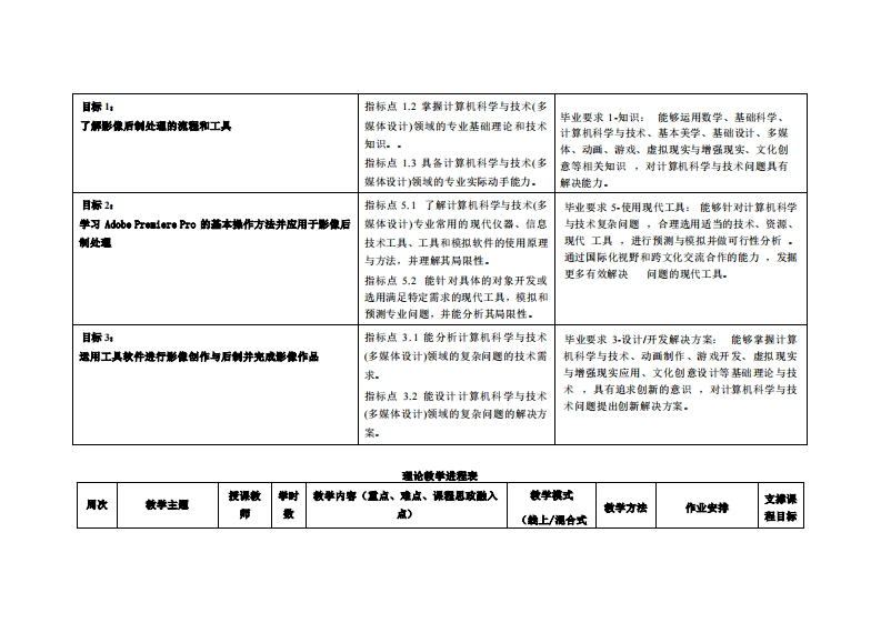 《彩像后制处理实务》教学大纲课程名幕:影像后制处理实务课程提别(岛修进修):选修裸癯英文名森:1 ge post-processing practice总学时同学时/学分:32/42其中实数/实液学时:160先修课程:数字图像处理与数字绘图后续课是支排短视频创作授课时间:1至8周量三14节授课地点:机电楼303机房视裸对康:2023级多煤体系1班开课学愧:粤台产业科技学院多煤体设计系任漂数师姓名/职膏:卢娟副致授答鞭时间、地点与方式:实验楼3031每次课的课前、课间和课后,采用一对一的问答方式:2每次习题课,采用集中讲解方式。课程考模方式:开卷()闭卷()课程论文()其它(V)使用教材,《Premiere视類编辑案例教程》王世老杨晓庆。人民邮电出版社课程葡介:本课程主要在教导学生影像后期制作技巧,内容主要包括Adobe Pren1 ere Pro的基本操作方法及编辑技巧,也将延伸到dobe其他创作工具如AfterEffects的综合应用,本课程将以项目任务式案例式进行,通过任务引导学生进行学习,使学生能够深入学习软件并启发其设计思路,通过扩展案例和项目演练拓展学生的实际应用能力。课程微学目标及对毕业要求指标点的支撑:课程教举目标支排毕业要求湘标点华业要求
