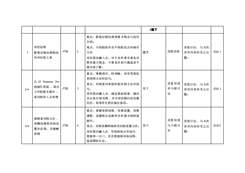 《影像后制处理实务》教学大纲课程名幕:影像后制处理实务课程类别(必修选修):选修裸程英文名称:Inage post-nrocessing practice总学时/圆学时/学分:32/42其中实驰/实液学时:16先修课程:数字图像处理与数字绘图后续课程文排:短视频创作提课时间:9至16周里期四14节授课地点:机电楼401授课对津2024级多煤体系1班开课学晓:粤台产业科技学院多媒体设计系任漂数师娃名/职称:卢娟副数授答疑时间、地点与方式:机电楼4011每次课的课前、课间和课后,采用一对一的问答方式:2每次习题课。采用集中讲解方式,课程考核方式:开卷()闭卷()课程论文()其它(、)使用做材:《影视编辑与后期制作标准教程Prem1ere+After Effects+Audition》魏观雨杨晓笛,清华大学出版社课程简介:本课程主要在数导学生影像后期制作技巧,内容主要包括Adobe Preiere Pro的基本操作方法及编辑技巧,也将延伸到Adobe其他创作工具如Afterf心ts的综合应用,本课程将以项目任务式案例式进行,通过任务引导学生进行学习,使学生能够深入学习软件并启发其设计思路,通过扩展案例和项目演练拓展学生的实际应用能力.课程数学目标及对毕业要求指标点的支撑:课程妆举目标变排毕业要求指标点毕业要求