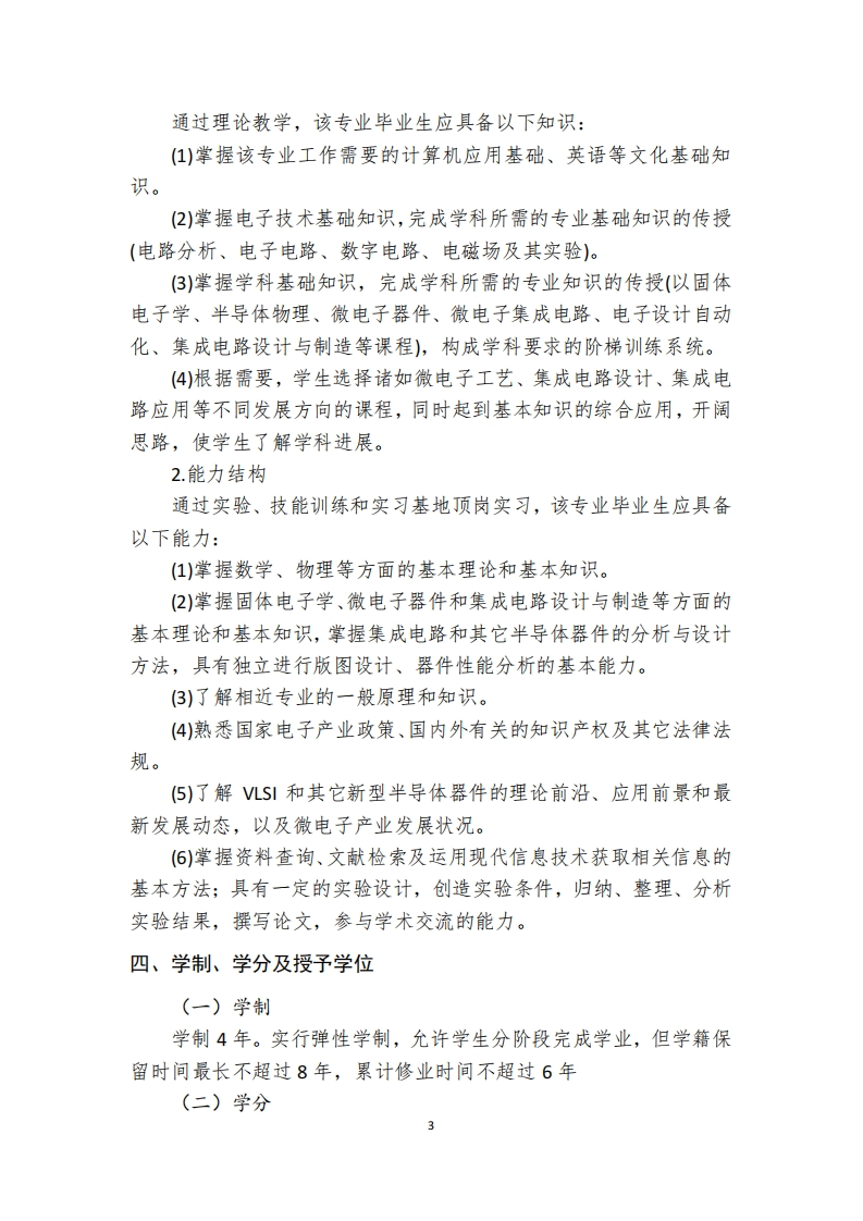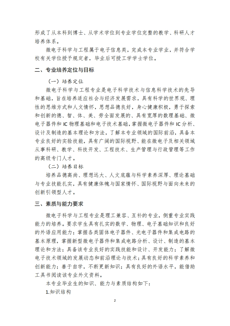 兰州大学物理科学与技术学院微电子科学与工程专业人才培养方案(2019版)一、专业简介微电子科学与工程是物理学、电子学、材料科学、计算机科学、集成电路设计制造学等多个学科和超净、超纯、超精细加工技术基础上发展起来的一门新兴学科。微电子学是21世纪电子科学技术与信息科学技术的先导和基础,是发展现代高新技术和国民经济现代化的重要基础。主要研究半导体器件物理、功能电子材料、固体电子器件,超大规模集成电路(U儿S)的设计与制造技术、微机械电子系统以及计算机辅助设计制造技术等。微电子科学与工程的发展使得电子信息产业向智能化、微型化、集成化的方向迈进,使人类的生活方式发生了巨变,诸多高精尖技术与装置得以实现。微电子材料、工艺以及元器件与集成电路的迅猛发展不仅促进了信息技术日新月异,而且为其它诸多学科和领域带来新的发展契机,如在民用消费电子、信息通讯、计算机、工业自动控制、航空航天系统、灵敏探测、医疗诊断、生物信息获取、国防与信息安全等领域显示出令人振奋的应用前景。微电子科学与工程的发展必将促进人类科技进步和生活水平的提高。兰州大学微电子科学与工程专业的前身是设立于1958年的半导体专门化,是全国首批设立该专业的八所院校之一。1982年设立半导体物理与器件专业方向。2001年经教育部批准建设成为微电子学与固体电子学专业。2012年根据教育部针对本科专业目录的修订更名为微电子科学与工程专业。此外,兰州大学1993年设立微电子学与固体电子学二级学科硕士点。2000年设立微电子学与固体电子学二级学科博士点。2018年微电子学与固体电子学二级学科博士点调整为微电子与器件物理二级学科博士点。2008年设立集成电路工程专业学位硕士点并于2019年调整为电子信息专业学位硕士点。目前,