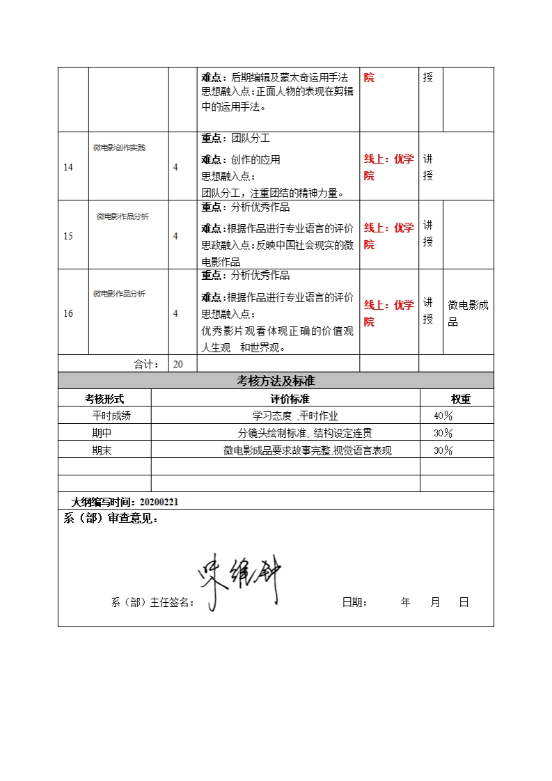 《微电影制作》教学大纲课程名称:微电影缌作课程类别(必修选侈):选修课程英文名称:microfilmmaking总学时/调学时学分:32其中实验实践学时:20先侈课程:视觉语言摄影剪辑软件授课时间:9-16周授课地点:2018计技设计1班授课对象:2018计技设计1班开课学院:多煤体设计系任课教师姓名职称:红叶答疑时间、地点与方式:2018计技设计1班课程考核方式:开卷()闭卷()课程论文()其它(√)考查使散材:微电影创作郭艳梅慕课教学参考资料:影视视听语言张菁中国传媒大学出版社2014.1.1微电影教程陈勤人民邮电出版社2017.61课程简介以网络技术为核心的新媒体,将人们带入了全媒体的新时代;每一个普通民众都能便捷、低成本的参与到媒介传播上来。微电影征是在此背景下产生的。本课程是研究微电影创作规律和方法的一门学科,是媒体专业的一门必修课。微电影创作在原电视作品分析与制作课程基础上建立,该课程吸纳国内外学术包括传播学、艺术学、影视学、信息学等相关学科最新研究成果,力图将前沿传播学理论和丰富鲜活的影视实践按照影视教学规律联系起来。课程教学日标本课程与学生核心能力培养一、知识目标:之间的关联授课对象为理工1理解微电影的定义、分类、发展历程、优秀案例强化理解;科专业学生的课程填写此栏):2.熟悉天然产物和有机化合物的分离鉴定和结构测定的机关技核心能动1.术手段。核心能动2.二、能力目标:核心能动3.1.熟练掌握微电影制作的前期剧本创作分镜,中期拍摄构图核心能动4.灯光等,后期的剪辑知识的应用;核心能动5.2.学会使用电影语言进行实践的应用,创作出微电影核心能动6三、素质目标:核心能动7.