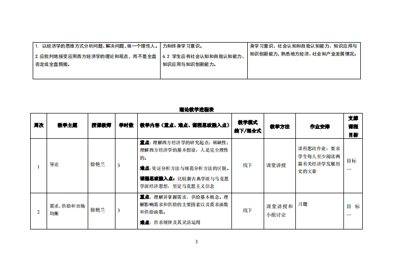 《微观经济学)数学大纲课程名称:微观经济学课程类别《必修/选修):必修课程莫文名称:Micro8 conomics总学时/同学时/学分:48/3/3其中验/实哦学时:0先修课程:徽积分后球课程支排:投资学提课时间:2-17周四9-11节授课地点:实3138裸对橡:2024金融1班开课学瑰:粤台产业科技学院任课师姓名只称,体施兰答时间、地点与方式:周四7-8,313,15377014226漂租海樵方式:开卷()闭卷(√)课程论文()其它《)使用做材:马克思主义理论研究和建设工程重点教材,《西方经济学》编写组:西方经济学(第二版)上册,高等教育出版社,2019年9月,敏学争考资料:1、高鸿业西方经济学(第八版·数字教材版),中国人民大学出版社,20212、曼昆.经济学原理(第八版),北京大学出版社,2020.3、微观经济学_武汉大学_中国大学N00C(慕阑)(icourse163.ord课程简介:《微观经济学》是经管类专业的基础课和必修课。通过该门课程的学习,要使学生掌握微观经济学的基本原理和分析方法,能清楚地解释价格形成的机理,决定价格的主要因素、解释价格机制作用的原理、了解有关厂商行为的基本理论和市场运作的基本情况;培养学生对现实经济行为与经济现象的观察1