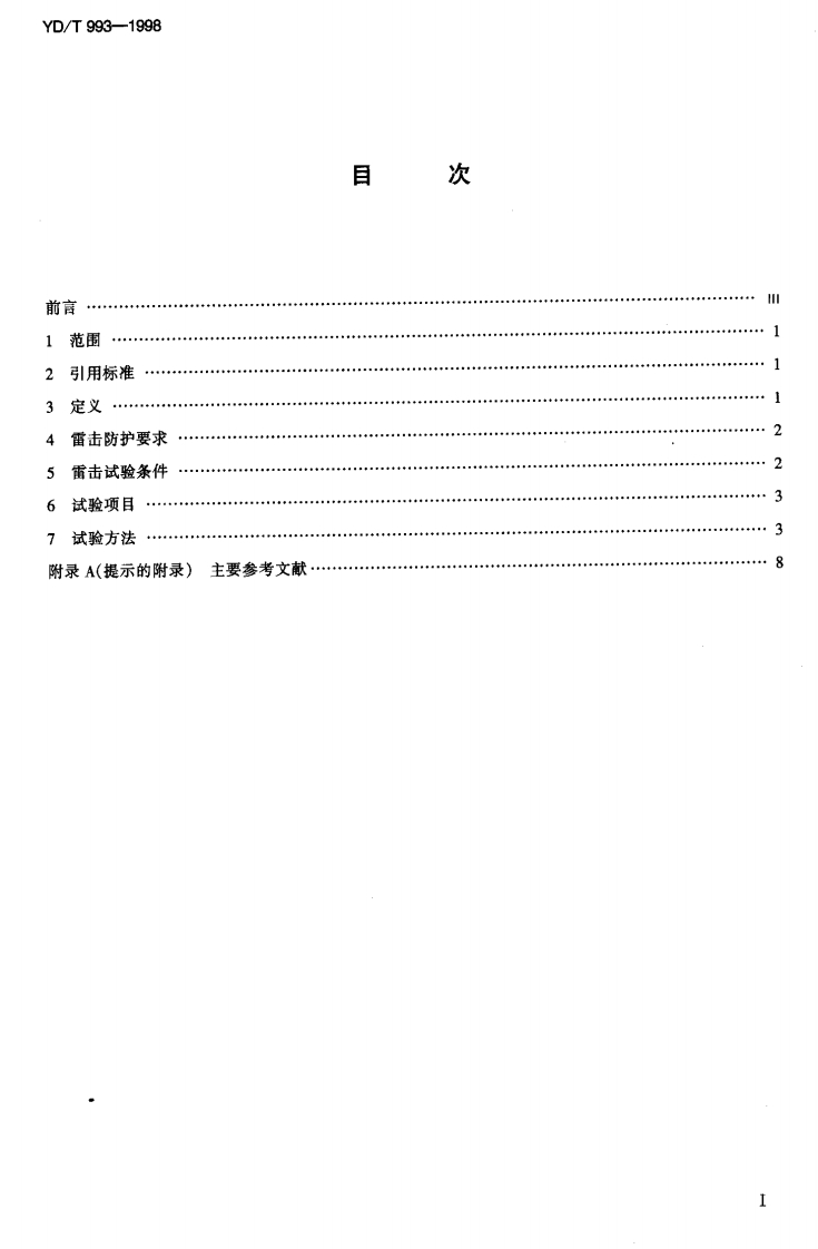 YDT993-1998348072@abc4个月前发布关注私信0.23MB11页040YDT993-1998此内容为付费资源,请付费后查看¥13¥23黄金会员免费钻石会员免费立即购买您当前未登录!建议登陆后购买,可保存购买订单付费资源 第1页 / 共11页 第2页 / 共11页 试读已结束,还剩9页,您可下载完整版后进行离线阅读 THE END标准规范 文本预览 M04中国通信标准2006.06.09YD中华人民共和国通信行业标准D/T993-1998电信终端设备防雷技术要求及试验方法Technical requirements and test methods of lightning resistibilityfor telecommunication terminal equipment1998.12.30发布1999-06-01实施中华人民共和国信息产业部发布 查看更多 收起部分 喜欢就支持一下吧收藏