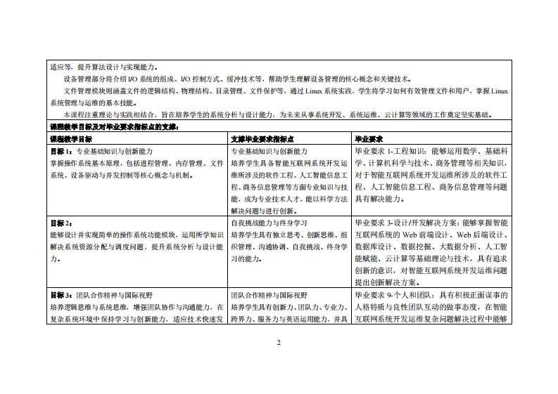 《操作系统》教学大纲课应名称:操作系线课和类别(必修选修)·必修课程英文名称:Operation system总学时周学时学分,48G/3其中实检实减学时,24先继课程:教据结构、计算机组成与系统结构后续课程支撑L加m系统应用与设计授课时间:1-16周■期一1,2节,■期四9,10节(1-8周)授课地点:实验楼503提课对津:2023鞭电商12班开裸学瑰:粤合产业科妆学陕任课妆师难名:诛保民刚妆设答鞭时间、地点与方式:课堂或裸后,放室或通讯状并,当面或战上密展课程考核方式:开卷()闭卷()课程论文()其它()使用微村《计算机操作系统(第4版)》,郁红英等,清华大学出版社,2022年1月,ISBN:978730257614妆学净考资料:无课程物介:本课程深入讲解《操作系统》核心概念,涵盖进程管理、内存管理、设备管理及文件管理四大模块。通过系统化的理论讲解与丰富的实战演练,台在帮助学生全面掌握操作系统的工作机制、关健技术和最佳实践。在进程管理部分,深入探讨进程的概念、状态转换、进程调度算法等,并通过Pym编程实践,模拟实现多种进程调度策略,如先来先服务、短作业优先等,从而加深对进程管理原理的理解和应用能力。内存管理模块则重点讲解内存分配与回收、虚拟内存技术、页面置换算法等,学生将通过Pym模拟实现各种内存管理算法,如首次适应、最佳