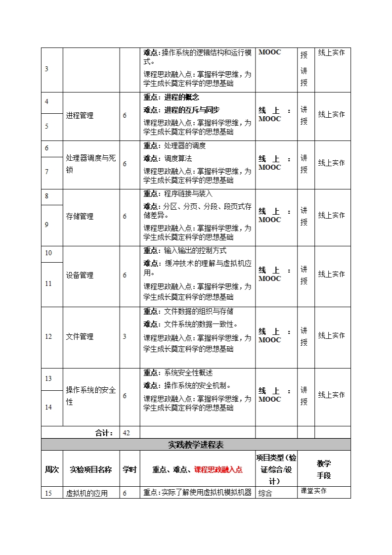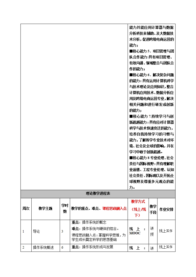 《操作系统》教学大纲课程名称:操作系统课程类别(必修选修):必侈课程英文名称:Operating System总学时/调学时学分:48/33其中实验实践学时:6先侈课程:授课时间:星期四(1-3节)授课地点:实605授课对象:18级计算机科学与技术系(电商专业)开课学院:皂台产业科技学院任课教师姓名职称:詹家榜/副授答疑时间、地点与方式:课程考核方式:开卷()闭卷(0)课程论文()其它()使用散材:操作系究念Abraham Silberscha立/Peter Baer Galvin/Greg Gagne机械工业出版社教学多考资料:课程简介:操作系统是计算机系统配置的基本软件之一。它在整个计算机系统软件中占有中心地位。操作系统质量的好坏,直接影整个计算机系统的行能与用户对计算机的使用器作系统能搬大的射充计算机系统功能,充分发挥系统中各种设备的使用率,提高系统工作的可性。操作系统的作用是对计算机系统进出行统一的调度与首理,提供各种强而有力的系统服务。操作系统是所有其他嗽件与计算机硬件的唯一接口,所有用户再使用计算都要得到操作系提供的服务。课程教学目标本课程与学生核心能力培养一、知识目标:之间的关联授课对象为理工1.知道《操作系统》这门学料的性质、地位和独立价值。知道科专业学姓的课程填写此栏):这门学料科的研究范围、分析框架、研究方法、学科进展和味来方向:■核心能力1.交叉知识的运2.导学姓对操作系统的以知硬九的深入,并为以后深入学习相用能动:具有运用数学、基础关理论及应用甜打下的基础。科学及计算机科学与技术相二、能动目标:关知识的能动;1.理解计算机系统的运算器、控制器、存储器、输入设备和输出口核心能力2.实验与数据解设备五大组成部件的有关基本凝念和基本原理。了解相应的有关新技读能动:具有计算机软件开发术和防法;与数据搜气分折解释的能力;2.通过课程的学习,使学生对操作系统的了解,对于系统设计,口核心能力3技术工具的应软硬件资源的应用賄一定的了解。用能动:具有计算器软件工程三、素质目标:技术应用、数据搜集纷折应用1.培养学生具有主动修与、积极进取、崇尚科学、探究科学的学跨境电商运营知识与技能、及习态度和思想意识;大数据技术的专业所需的技2.养成理论联系实际、科学严谨、认直细政、实事求是的科学态术、技能和使用软硬件辅助工度和吧业道德。具的能力;口核心能力4.计科与大数据分析专业能力:具有编程设计