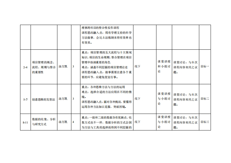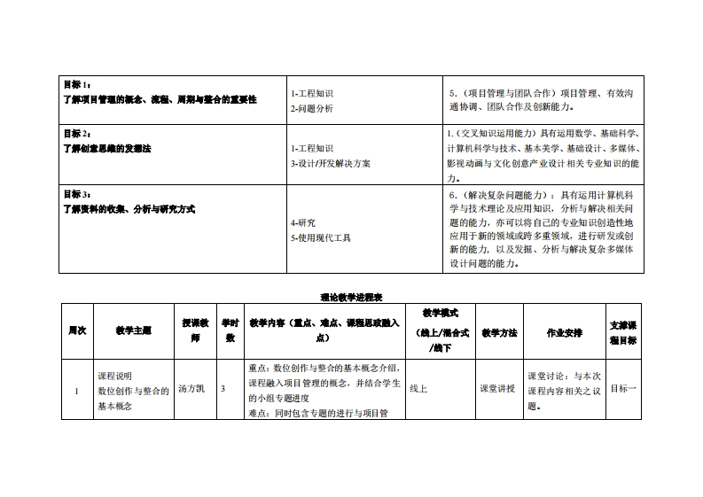 《数位创作与整合》教学大纲课名称,数位创作与整合I课和类别(必修选修)·必修课程英文名称:Digital creation and integration I总学时周学时学分,483/3其中实检实液学时,32先继课塞:后续课程支推授课时间:星期四13节(第1-16周)授课地点:实114课对律:2020级多媒体系1班开裸学粤台产业科技学院多媒体设计系任课就师姓名淋:汤方凯答展时间、地点与方式:实验楼203课狸考楼方式:开卷()闭卷()课程论文()其它(V)使用微村,《设计创意发想法》朱钟炎,丁毅·同济大学出版社课程物介:本课程将融入项目管理的概念,培养学生将数字媒体设计元素从主题的订定、创意的发想、资料收集、设计研究调查、实践、整合到完成一个作品,以一系列的训练流程让学生具备完成整个项目之能力。过程中并包含设计创意的实际案例的分析,藉由案例研究与讨论,了解其骨景、创意点、采取的策略与作法,并从中吸取经验与知识,进面可以应用于自身专题设计的数字创作与整合以验证所学。课程放学目标及对华业要求指标点的文排:课妆学目标支撑毕业要求指标点单业要求