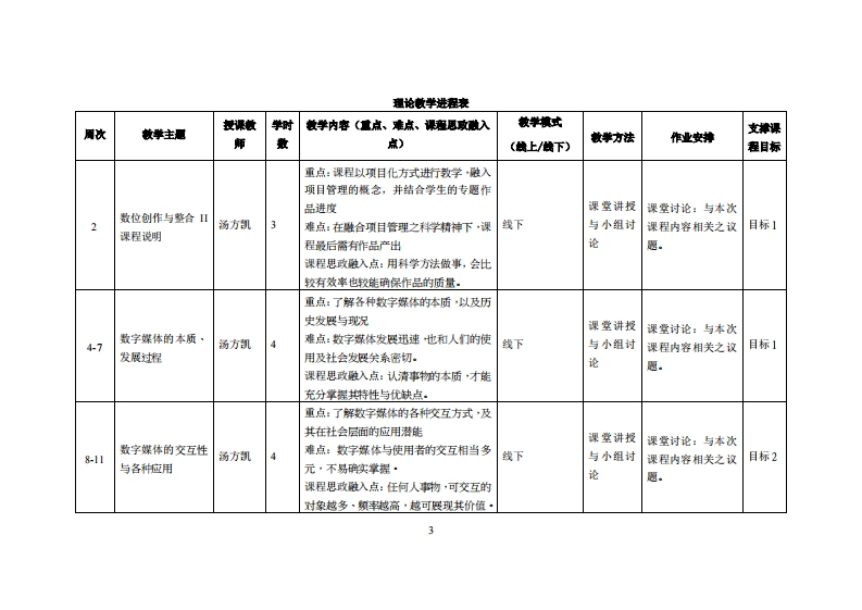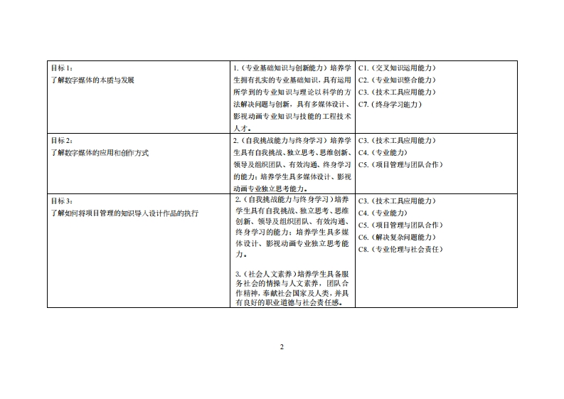 《数位创作与整合Ⅱ》教学大纲课斑名称:数位创作与整合Ⅱ课程类别(必雀选修):必修课程英文名称:Digital creation and integrationⅡ总学时周学时学分,48G/3其中实检实减学时,32先继课是:数位创作与整合1后续课程支推漫课时间:2·418周星期二5-7节授课地点:实验楼114提课对津:2020级多媒体系1班开裸学瑰粤台产业科技学院多媒体设计系任课微师姓名淋:汤方部容鞭时间、地点与方式:实验楼307课是考恢方式:开卷()闭卷()课程论文()其它(√)使用微村黄海燕等(2016)整合媒体设计数字媒体时代的信息设计·中国建筑工业出版社课程物介:本课程将以项目化的方式教学,从最开始的了解各种数字媒体的本质与发展脉络·以掌捍其各种应用的潜能·进而导入主题的拟定到最后完成整个作品,藉由执行全部流程,辅以课堂讲授之各阶段所需的知识点来进行学习,让学生具备更进阶更纯熟的执行设计案知识·技巧与能力,而项目管理的概念也将融入在教学中,让学生得以将科学的方法与观念应用于管理和整合设计流程,透过学生对于自己的作品进度的发表与反馈来验证所学·课程数学目标及对毕业要求洲标点的支排:课避妆学目标支撑单业要求湘标点华业要求