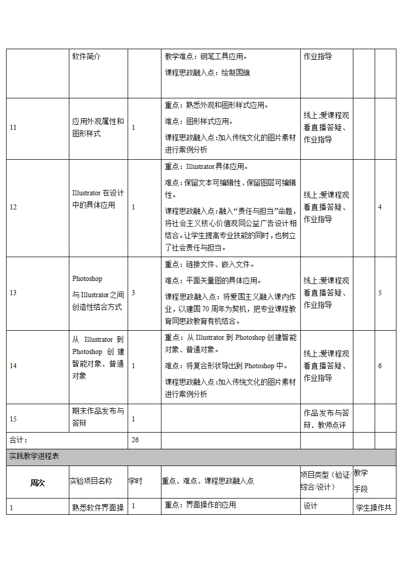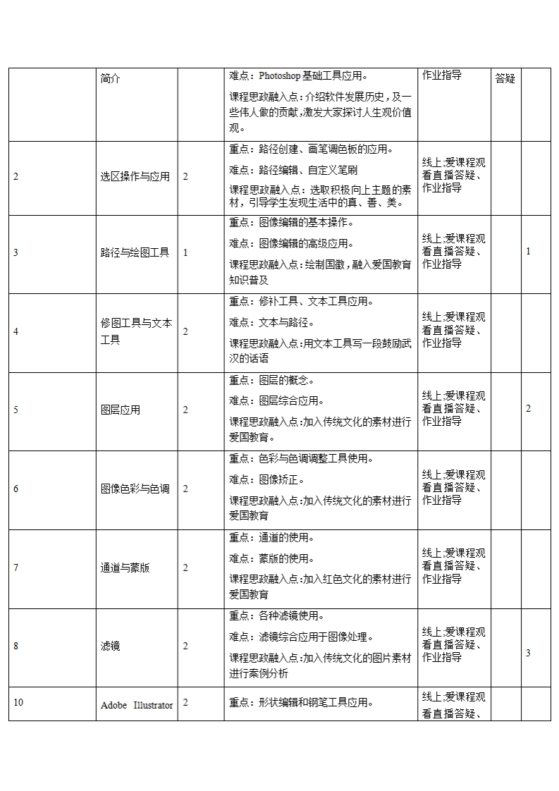 《数位影像处理与绘图设计》教学大纲课程名称:数位影像处理与会图设计课程类别(必修选修):选修课程英文名称:Digital image processing and drawing design总学时/周学时学分:48/3/3其中实验实践学时:24先侈课程:授课时间:周三9、10、11授课地点:实114授课对缘:2019多煤体设计系开课学院:皂台产业科技学院任课教师姓名职称:俞敏讲师答疑时间、地点与方式:周三9、10、11,实114,线上线下课程考核方式:开卷()闭卷()课程论文()其它(作品)使用敬材:李杰:《设计+制作+印刷+商业模版Photoshop+I11 ustrator实例教程》.人民邮电出版社.2015.03教学参考资料:1.Adobe公司著:《Adobe I11 ustrator CS6中文版经典教程》.人民邮电出版社.2014.082.李金蓉编著:《photoshop cs6设计与制作深度解析》.清华大学出版社.2013.06课程简介:本课程主要学习操作影像处理软件photoshop和绘图设计软件Illustrator软件。课程内容包括图像编辑和滤镜应用、路径与通道、图形绘制与编辑、Photoshop综合应用、Illustrator综合应用等,培养学生掌握对于图书封面、光盘封皮、平面广告、肛设计、照片处理等领域中应用软件进行艺术作品创作的技巧:课程教学日标本课程与学生核心能力培养知识目标:之间的关联授课对象为理工通过系统学习使学生能做到基本掌握photoshop.及Illustrator软件的科专业学生的课程填写此知识结构框架及要点,理解不同章节的重点和难点。栏):二、能力目标:核心能动1.1.培养学生掌握运用软件进行图像处理与绘图设计的墓础专业技能。核心能动2.2.培养学生能够运用基础表现工具进行设计作品创作的综合专业能力。核心能力3.三、素质目标:核心能动4.1.具备一定的艺术设计能力和思维能力,学习设计师对艺术设计的创作热诚。核心能动5.2.在综合练习时强调学生关心国家和时事的发展,用马克思主义唯物观的正确理念引导设核心能动6.计思维。核心能动7.核心能动8.理论教学进程表教学方式欧教学主题学时数教学的重点、难点、课程思政融入点教学作业(线上/线下)段安排Phootoshop基础2重点:Photoshop基础工具介绍。线上爱课程观讲看直播答疑、授、