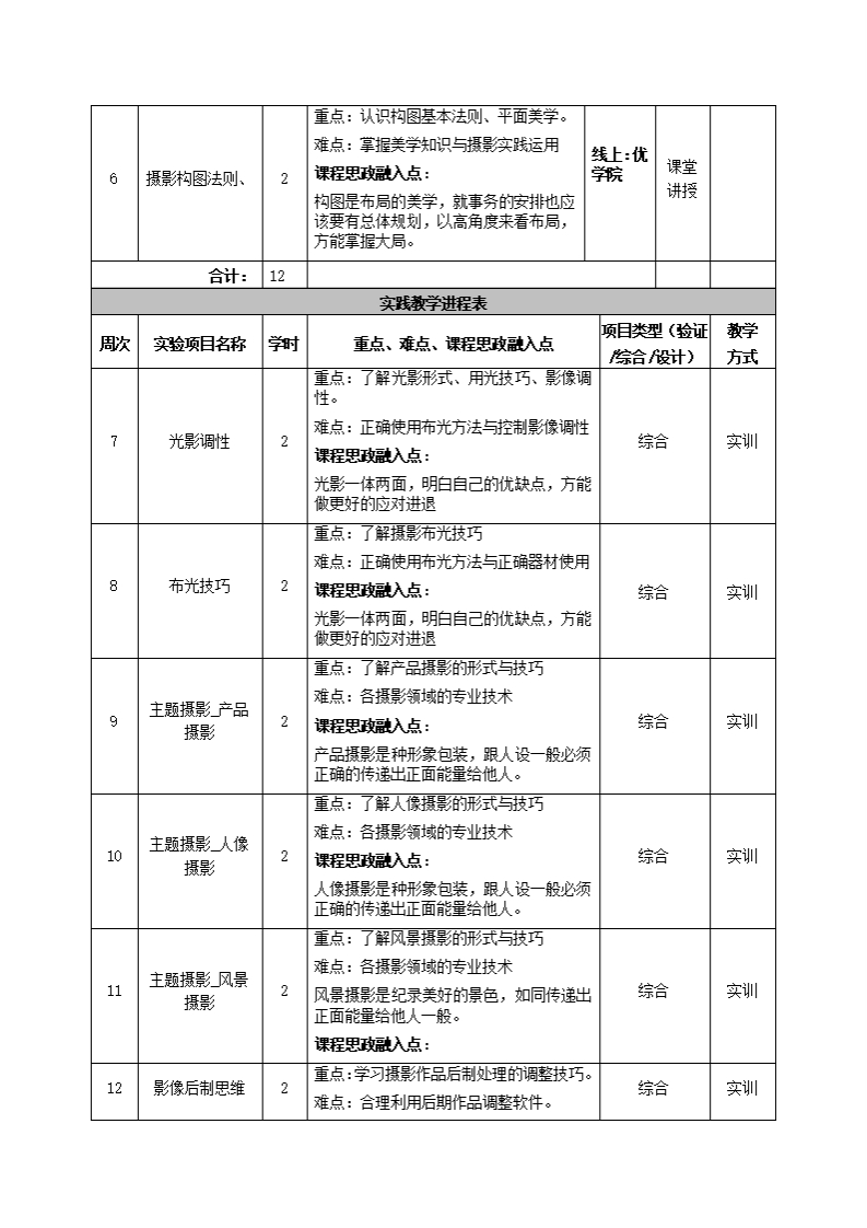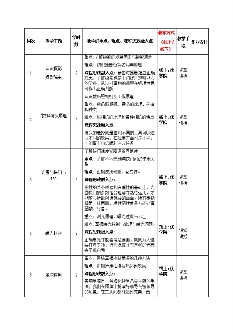 《数位摄影与应用》教学大纲课程名称:数位摄影与应用课程类别(必侈选修):必修课程英文名称:Digital photography and Application总学时周学时学分:32/22其中实验实践学时:20先侈课程:无授课时间:周一第5-6节授课地点:实验楼114/摄影知授课对像:2019级多煤体设计系开课学院:皂台产业科技学院任课教师姓名职称:陈维钟副授答疑时间、地点与方式:课程考核方式:开卷()闭卷()课程论文()其它()使散材:教学参考资料:数码摄影基础聂劲权上海人民美术出版社课程简介:认知摄影一一体验摄影给生活带来的无限乐趣,进而提高视觉的敏锐感觉和艺术表达的思维方式。摄影基础一一了解掌握照相机的基本结构和类型及数码单反工作原理。熟,练操作影像的技术控制(镜头、光圈、快门、测光、高反差条件下的曝光及白平衡、IS0、数码变焦)影像表现一一理论与实践结合,熟练掌握摄影构图技巧及摄影的后期制作与调整。课程教学日标本课程与学生核心能力一、知识目标:培养之间的关联授课对1.了解掌握照相机的基本结构和类型及数码单反工作原理。熟练操作象为理工科专业学生的影像的技术控制(镜头、光圈、快门、测光、高反差条件下的曝光及白平课程填写此拦):衡、IS0、数码变焦)■核心能幼1.2.熟练操作影像的技术控制(镜头、光圈、快门、测光、高反差条件口核心能动2.下的曝光及白平衡、IS0、数码变焦)■核心能动3.3.熟悉摄影构图技巧及摄影的后期制作与调整原理。口核心能动4.二、能力目标:口核心能动5.1.熟练掌握相机的基本操作及学会交换镜头的时机与操作;■核心能动6.2.学会使用布光器材,能进行商品摄影与摄影注题拍摄。口核心能动7.3.熟,练掌握摄影构图技巧及摄影的后期制作与调整口核心能动8.三、素质目标:1.体验摄影给生活带来的无限乐趣,进而提高视觉的敏锐感觉和艺术表达的思维方式。2.养成理论联系实际、结合理性与感性的综合运用、培养良好的观察能力、追求美感的良好态度和职业道德。理论教学进程表