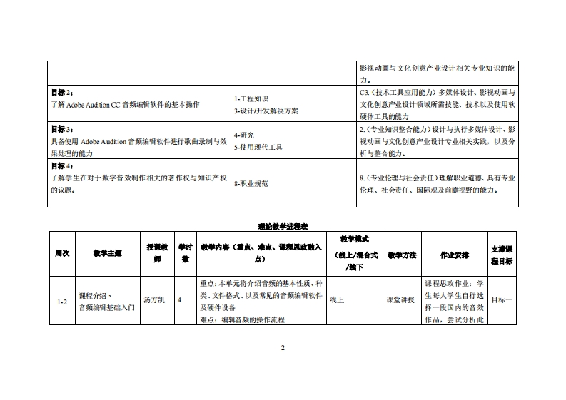《数位音效制作》教学大纲课避名称,数位音效制作课和类别(必修选修),选修课程英文名称:Digital audioproduction总学时周学时学分,322/2其中实险实戒学时,20先修课塞:后续课程支撑授课时间:星期一34节(第1-16周)授课地点:实114课对律:2020级多媒体系1班开裸学粤台产业科技学院多媒体设计系任课就甲姓名淋:汤方凯答展时间、地点与方式:实验楼403课程考楼方式:开卷()闭卷(V)课程论文()其它(V)使用妆村,《Adobe Audition CC音频情辑盖础微程》文杰书洗偏着清华大学出版社课程物介:数位音效制作是多媒体专业人员的必备的主要技能之一,课程的主要目的是协助学生学习关于A心A如dto如的基础知识以及音效编辑,并建立数字音效的混合、编辑、控制和效果操作与处理之能力。学生除了要学习音颖编辑的理论知识,也必须培养实际动手实作的能力,进面掌握音频的处理方法,并制作出完整的作品。课程教学目标及对毕业要求指标点的支排:裸程妆学目标支撑单业要求指标点单业要求目标1:1-工程知识1.(交叉知识运用能力)具有运用数学、基础科学了解音频编辑的基础知识。2-问愿分析计算机科学与技术、基本美学、基础设计、多媒体、