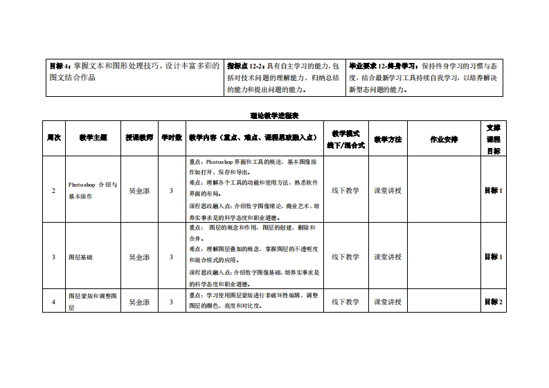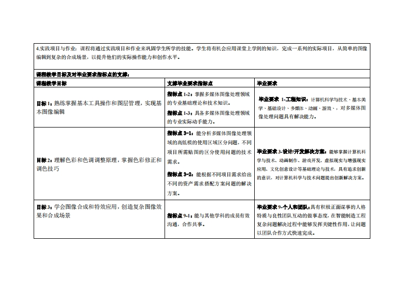 《数字图像处理与数字绘图》教学大纲课名称,数字图像处理与数字绘图课和类别(必修选修)·必修课程英文名称:总学时周学时学分,48W33其中实险实戒学时,16先修课塞:后续课程支推授课时间:2至17周星期二5-7节授课地点:堂114课对律:2023多媒体1班开裸学洗:粤台产业科技学院任课就师姓名淋:吴添/高级工程师答展时间、地点与方式:1每次课的课前、课间和课后,采用一对一的问答方式:2每次习题课,采用集中讲解方式。课庭考被方式:开卷()闭港《)课程论文()其它《√)非试港类报告1·使用微村《Ph0t0shcp手绘从新手到高手(从新手到高手)》(第一版)作者:崇霄2020年,清华大学出版社。ISBN编号:9787302555506课避信介:1基础入门:课程将从Pot00p的基础知识开始,介绍软件界面、工具栏、图层、选择工具等基本概念。学生将学会如何打开、保存和导出图像,以及如何使用常用的编辑工具进行简单的图像调整和修饰2高级技巧:随着课程的深入,学生将学习更高级的Photoshop技巧,包括图层蒙版、调整图层、滤镜效果等。他们将了解如何使用图层样式和调整图层蒙辰来增强图像,并探索Photosh0p的各种滤镜和特效功能3图像合成与修饰:这部分课程将重点介绍图像合成和修饰技术,学生将学会如何将多张图像合成为一个完整的场景,并学习修饰技巧如移除不需要的元素、修复图像缺陷以及添加特效和文字等
