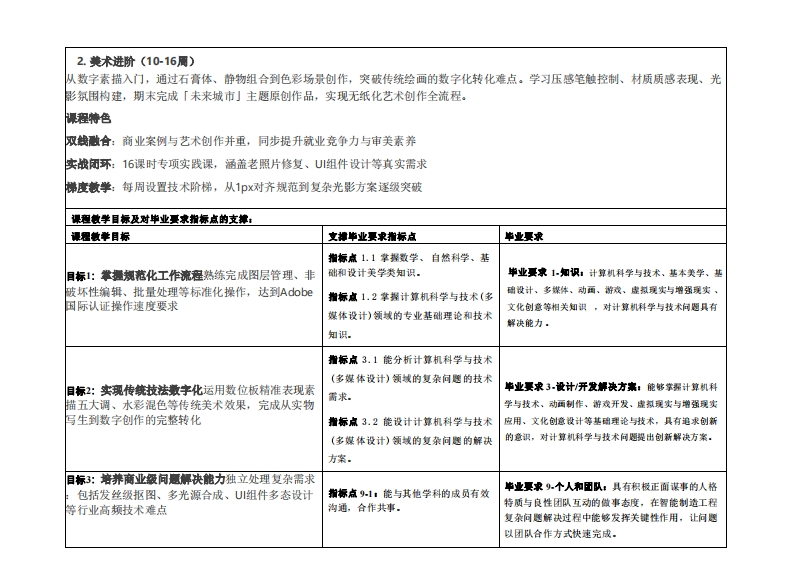 《数字图像处理与数字绘图》教学大纲课程名幕:数字图像处理与数字绘图课程类别(必修选修》:必修课程英文名称Digital Image Processing and Digital Drawing总学时/周学时/学分:48/33其中实实度学时:16先修课程:无后编课程文排:数字建模、项目化课程,游戏设计,贴图设计与实作,专题制作授课时间:1至16网星期二34节,9-16州星期二9-10节授课地点:机电楼303授裸对康:2024多煤体1班开课学陕:粤台产业科技学院任漂数师姓名职称:吴金添容振时间、地点与方式:1每次课的课前、课间和课后,采用一对一的问答方式2每次习题课,采用集中讲解方式.课程考核方式,开卷()闭卷()课程论文〔)其它(√)非试卷类报告1、使用数材:《Ph0sh©p手绘从新手到高手(从新手到高手)》(第一版)作者:柴霄2020年,清华大学出版社.1SBN编号:9787302555506课程简介:本课程为16周系统化训练,融合技术实操与艺术创作,分三阶段进阶:1.基础实战(1-9周)零基础掌握PS核心功能,通过网页按键设计、证件照精修、影视级合成等案例,攻克选区抠图、调色修复、透视匹配等难点,期中考核完成商业命题设计,培养规范化的行业操作习惯。