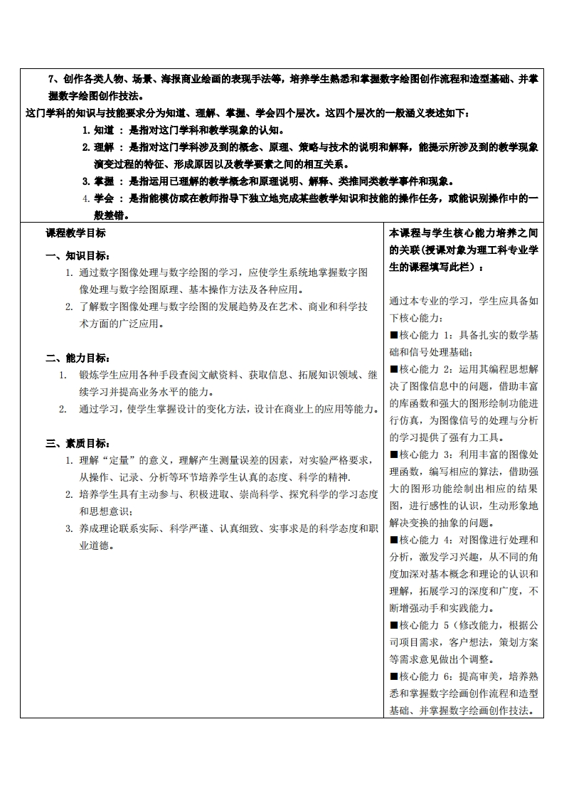 《数字图像处理与数字绘图》教学大纲课程名称:数位绘图与原画创作课程类别(必修/选修):必徐课程英文名称:总学时/周学时/学分:48/3/3其中实验/实践学时:32/0先修课程:授课时间:授课地点:授课对象:2021计技设计1班(粤台)开课学院:粤台产业科技学院任课教师姓名/职称:李海/副教授答乘时间、地点与方式:1.每次课的课前、课间和课后,采用一对一的问答方式:2.每次习题课,采用集中讲解方式课程考核方式:开卷()闭卷()课程论文()其它()使用教材:1、《数字图像处理》(第四版)作者:(美)Rafael C.Gonzalez(拉斐尔·C.冈萨雷斯),Richard E.Woods(理查德·E。伍兹)2020年,电子工业出版社。教学参考资料:2、《数字绘图的光厢与渲染技术》作者:(美)波恩,杜静芬译,2019年,清华大学出版社3、《数字绘图创作》作者:王作者:赵晓阳,2018年,西南师范大学出版社主要参考文献1、冈萨雷斯著,阮秋琦译.《数字图像处理》(第三版),电子工业出版社。2013年2、塞利斯基著,哀海舟译.计算机视觉:算法与应用,清华大学出版社,20123、杨丹,赵海滨,龙哲等编著.MATLAB图像处理实例详解清华大学出版社,2013课程概述1、为计算机视觉、模式识别等领域从事研究与开发打下坚实的理论基础。2、主要任务是学习数字图像处理的基本概念、基本原理、实现方法和实用技术,并能应用这些基本方法开发数字图像处理系统,为学习图像处理新方法莫定理论基础。3、数字绘图创作是高校数字媒体专业的基础课程。4、绘国是绘画艺术领域派生出来的一种应用美术科学,它不仅是绘图师的主观创作,更是以商业或社会公益为目的,通过各种绘画语言及符号进行的视觉表达。教学目标1、了解图像处理的概念及图像处理系统组成。2、掌握数字图像处理中的灰度变换和空间滤波的各种方法。3、了解国像变换,主要是离散和快速傅里叶变换等的原理及性质。4、理解图像复原与重建技术中空间域和频域滤波、彩色图像的基础概念、模型和处理的各种方法。5、了解形态学图像处理技术、图像分制的基本概念和方法。6、从绘图艺术和计算机绘画软件技术紧密结合的视角,采用讲练结合的散学模式,系统讲解绘画的发展,主流绘画软件的功能与应用。