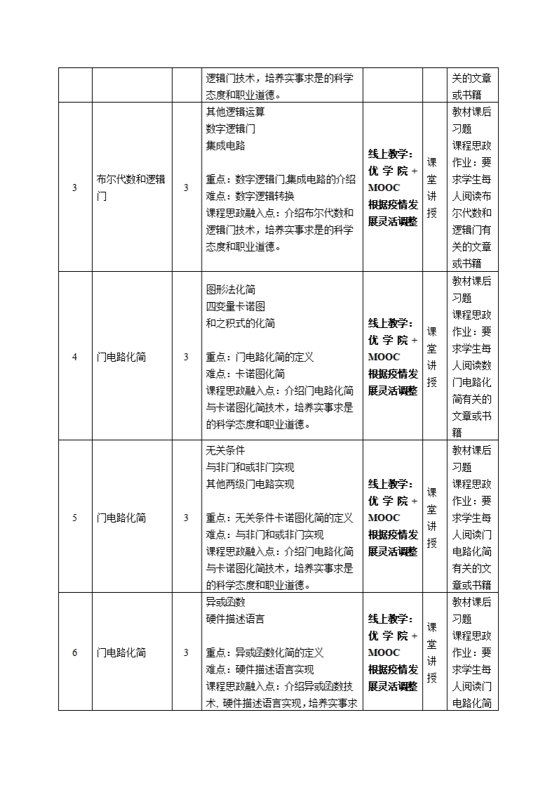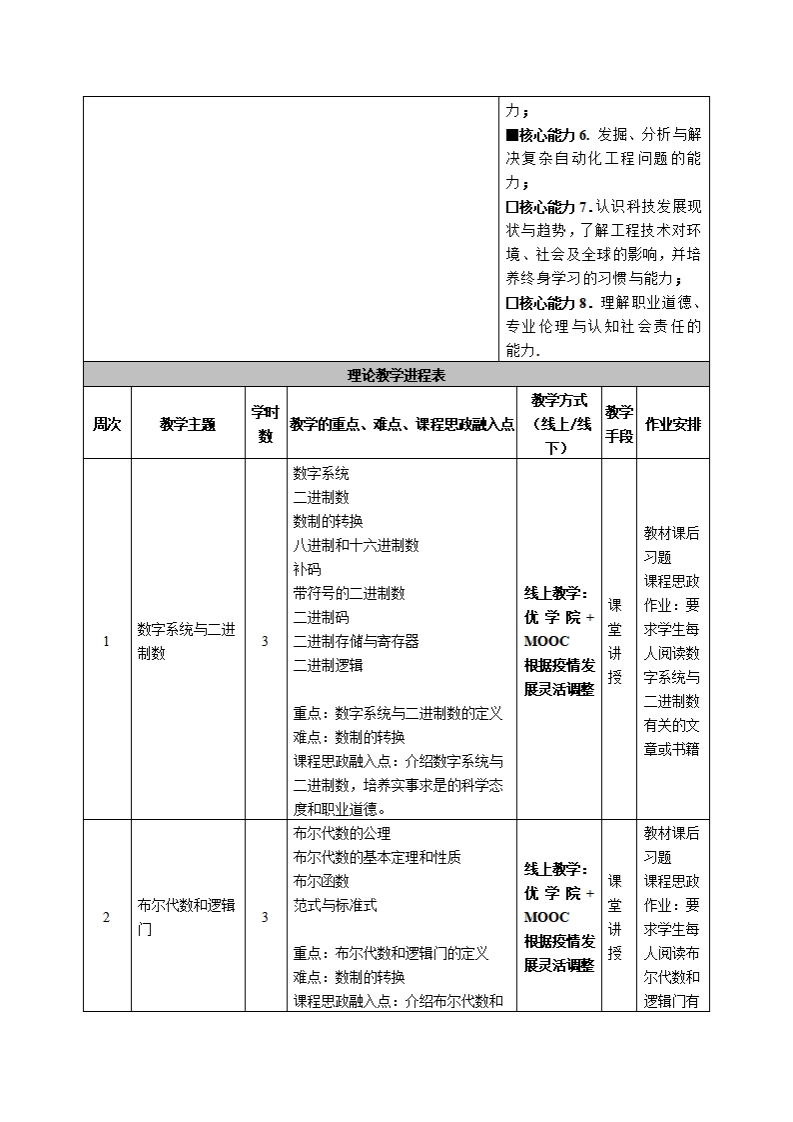 《数字逻辑》课程教学大纲课程名称:数字逻辑课程类别(必修选修):选修课程英文名称:Digital Logic总学时周学时学分:48/33其中实验实践学时:先侈课程:无授课时间:1至16周,周xx-x节授课地点:授课对象:2018级自动化系1班、2019级计算机科学与被术系跨境电商)1班开课学院:皂台产业科技学院任课教师姓名职称:明牡/副授答疑时间、地点与方式:1每次课的课前、课间和课后,采用一对一的问答方式;2每次习题课,采用集中讲解方式。课程考核方式:开卷()闭卷()课程论文()其它()使用散材:《数字设计与Verilog实现》,徐志军,电子工业出版社。教学参考资料:1.各精品资源共享课网站。线上:中围M00C教学课件https:www.jooursc16③.orgfourse/SEU-10017560132id1206629205课程简介:本课程系统介绍数字电路设计,旨在教会学姓关于数字设计的基本念。数字系统和二进制数、布尔代数与逻辑门、门级最小化,组合逻辑、同步时序逻辑、寄存器和计数器、存储器和可程逻辑设备、寄存器传输级设计、异步时序逻辑、数字集城电路、标谁IC和FPGA实验、标谁图形符号等。课程教学日标本课程与学生核心能动培养之间一、知识目标:的关联授课对象为理工科专业1.运用数字逻指设计的基础课程以及CM0S电路。学生的课程填写此拦):2.掌运用数字逻辑设计的基础课程及结构;■核心能力1.掌握从事自动化领域所需数学和基础科学二、能动目标:知识;1.培养学生(1)布尔逻辑,(2)逻门,(3)同步有限■核心能力2.对自动化系统状态机,(④数据通路控制器分析问题的能动。或产品的技术进行分析、解释2.培养学生寄存器传输级设计、异步时序逻辑、数字集城电相关数据及独立设计的能力;路分析向爱的能动,■核心能力3.掌握自动化专业中“信息、控制和系统的基三、素质目标:本原理及应用方法,了解自动1.培养学生具有主动修与、积极进取、崇尚科学、探究科学化领域的前沿和发展动态;的学习态度和思想意识;■核心能力4.具有创新意识2.养成理论联系实际、科学严谨、认直细致、实事求是的科和自动化新产品、新设备进行学态度和吧业道德。开发和设计的能力;口核心能动5.项目管理、有效沟通协调、团队合作及创新能