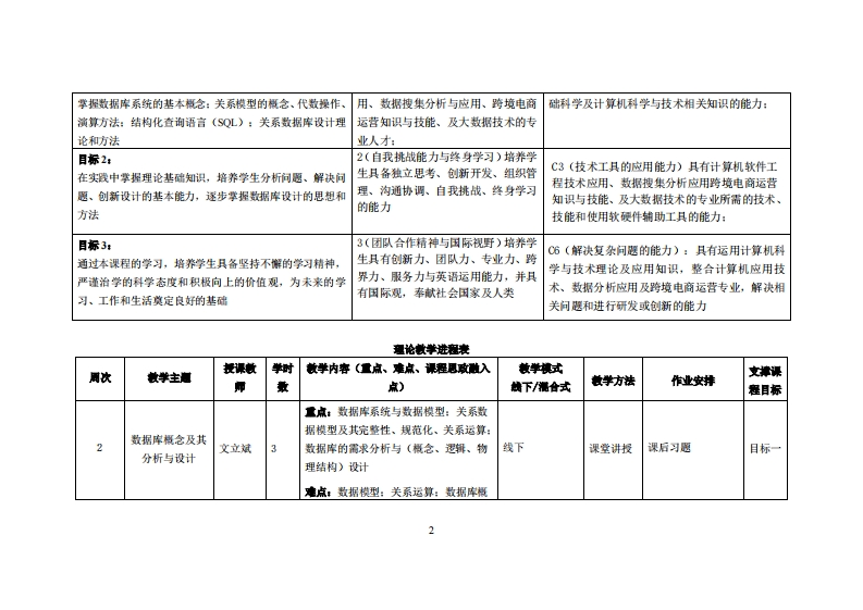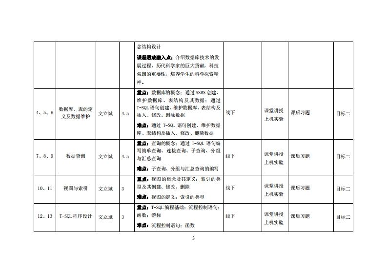 《数据库原理及应用》教学大纲课名称:数据库原理及应用课和类别(必修选修)事必修课程英文名称:Principle and application of database总学时周学时学分,48w3/3其中实检实液学时,22先继课是:高级语言程序设计、离散数学、数据结构后续课程支撑C#程序设计、Pyon程序设计、软件工程授课时间:2、418周星期二57节授课地点:实606机房课对律:2021级计算机科学与技术(电商)开裸学陕:粤台产业科技学院任课就甲姓名林:文立斌/高级工程师答展时间、地点与方式:课程考核方式:开卷()闭卷(√个课程论文()其它()使用微村:数据库黑理与应用批提一SQLServer2012尹志宇、郭晴(主情)课程物介:《数据库原理及应用》是高等院校计算机科学与技术本科等专业的专业必修课程,是计算机科学与技术基本理论和知识体系的重要组成部分,是一门理论性和实践性都很强的课程,也是后续专业课程学习的重要基础。通过本课程的学习,学生除需要理解并掌握数据库系统的基本原理、数据模型、关系数据模型等基本概念外,更重要的是能针对具体的应用场景进行数据库的分析与设计,能通过$QL语言来创健和维护数据库、数据表、视图、索引、存储过程、触发器、数据查询等数据对象,并结合所熟悉的程序设计语言及开发环境在应用软件中定义和操作数据。课程敏学目标及对单业买求指标点的支排裸妆学目标支撑单业要求湘标点毕业要球目标1:1培养具有计算机软件工程技术应C1(交叉知识的运用能力):具有运用数学、基