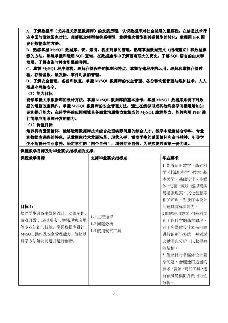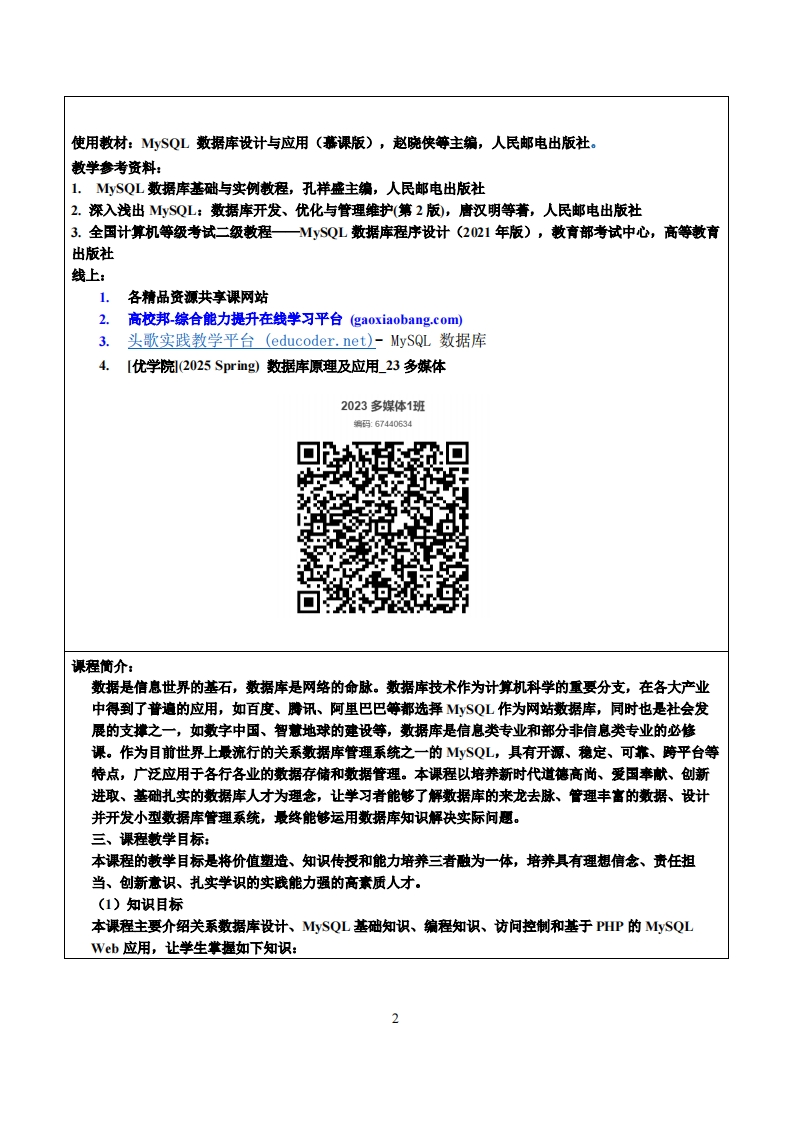 《数据库原理及应用》教学大纲课程名称:数据库原理及应用课程类别(必修/选修):必修课程英文名称:Database Principle and Application总学时/周学时/学分:48/3/3其中实验/实践学时:8先修课程:Programming I&IⅡ、Website Design后续课程支撑:授课时间:1-16周周五5-7节授课地点:606机房授课对象:2023多煤体设计1班开课学院:粤台产业科技学院任课教师姓名职称:时维宁副教授答疑时间、地点与方式:1每次课的课前、课间和课后,采用一对一的问答方式:2.每次习题课,采用集中讲解方式课程考核方式:开卷()闭卷(√)课程论文()其它(√)1