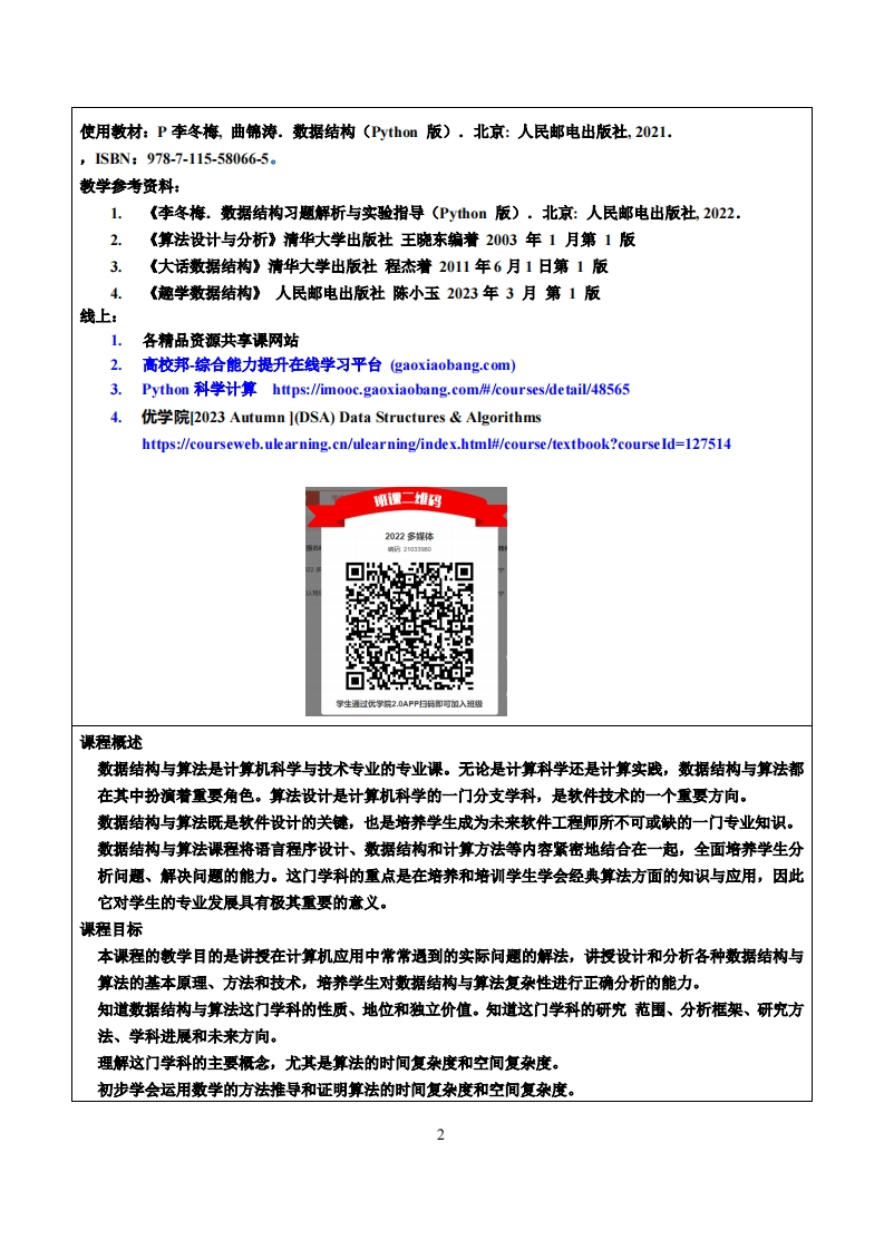《数据结构与算法》教学大纲课程名称:数据结构与算法课程类别(必修/选修):学科专业必修课课程英文名称:Data Structures and Algorithms总学时/周学时学分:48/2/2其中实验/实践学时:16先修课程:程序设计【、Ⅱ,计算机概论后续课程支撑:数据库,图形图像、人工智能授课时间:2-17周周二1-3节授课地点:606机房授课对象:2022计技1班开课学院:粤台产业科技学院任课教师姓名职称:时维宁副教授答疑时间、地点与方式:1.每次课的课前、课间和课后,采用一对一的问答方式(实验楼215):2.每次习题课,采用集中讲解方式课程考核方式:开卷()闭卷(√)课程论文()其它(√)1