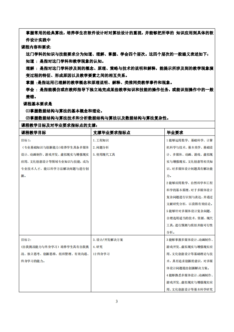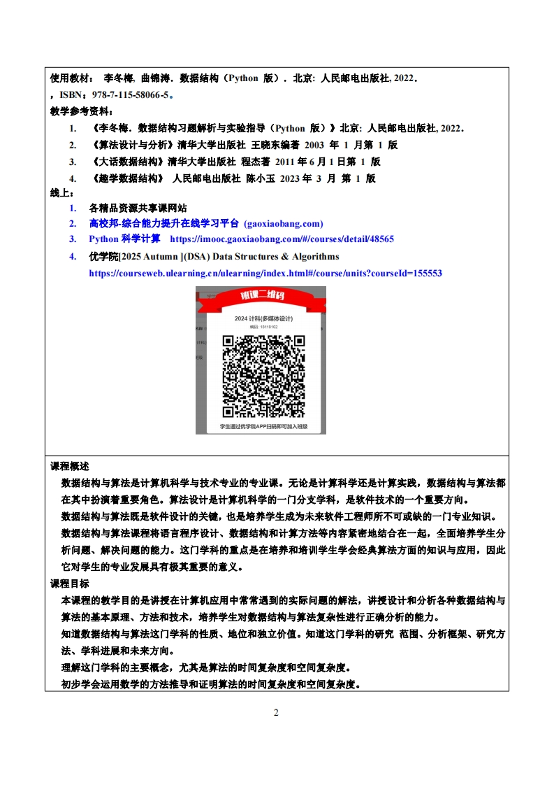 《数据结构与算法》教学大纲课程名称:数据结构与算法课程类别(必修/选修):学科专业必修课课程英文名称:Data Structures and Algorithms总学时/周学时/学分:48/2/2其中实验/实践学时:8先修课程:程序设计I、山,计算机概论后续课程支撑:进阶面向对象程序语言、数据库原理与应用、游戏开发实务授课时间:3-18周周一1-3节授课地点:605机房授课对象:2024计技1班开课学院:粤台产业科技学院任课数师姓名/职称:时维宁/副教授答疑时间、地点与方式:1.每次课的课前、课间和课后,采用一对一的问答方式(实验楼215):2.每次习题课,采用集中讲解方式课程考核方式:开卷()闭卷(√)课程论文()其它(√)1