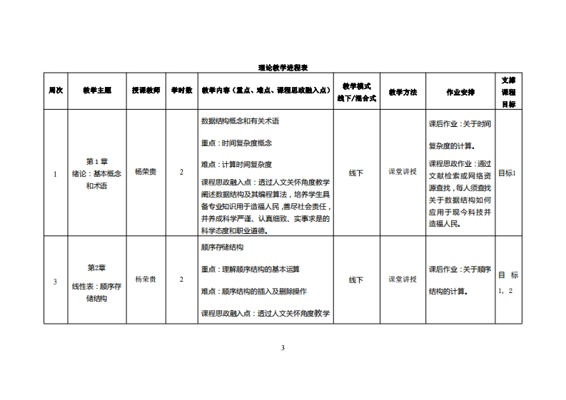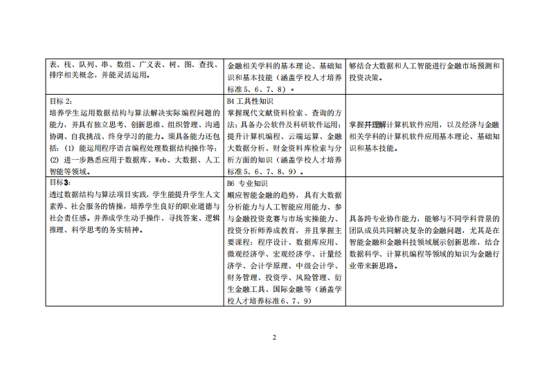 《数据结构与算法》教学大纲裸程名称:数据结构与算法课程类别(必修选修),专业任选课课程英文名称:Data Structure and Algorithm总学时周学时/学分,32/2/2其中实险实戒学时:16先集课是:程序设计【、程序设计Ⅱ后续课程支排:数据库应用Database Application授课时间:2-17周星期一7-8节授课地点:实503机房提课对津:24金败1班(科技)、24金做2班(管理)开课学洗:粤台产业科技学院任课敏即姓名/职淋:杨荣贵/刷教授答鞭时间、地点与方式:课堂或课后,教室或通讯软件,当面或线上答疑课程考核方式:开卷()闭卷()课程论文()其它()使用#材:数据结构PYTHON语言描遮,张光河,人民邮电出版社,ISBN:9787115562807敏学◆考资料:数据结构(C+语言描述),吉根林等,高等教育出版社,1SBN9787040405606课程简介:《数据结构》是经济与金融专业一门重要的专业基础课。通过本课程的学习,使得学生从数据逻辑结构、存储结构和基本运算算法设计三个层面掌握基本的数据组织和数据处理方法,能够从问题出发设计面向数据结构的求解算法,具有一定的算法时间复杂度和空间复杂度分析能力。为后续课程如数据库应用、人工智能等课程学习打下基础。课程妆学目标及对毕业要求指标点的支撑:裸程教学目标支撑单业要求指标点毕业要求目标1:B2自然科学基础知识掌握大数据分析技术,具备运用编程语言(如培养学生具备数据结构与算法相关知识,掌握线性掌握计算机软件应用,以及经济与PyhO如、R等)开发金融交易策路的能力,能