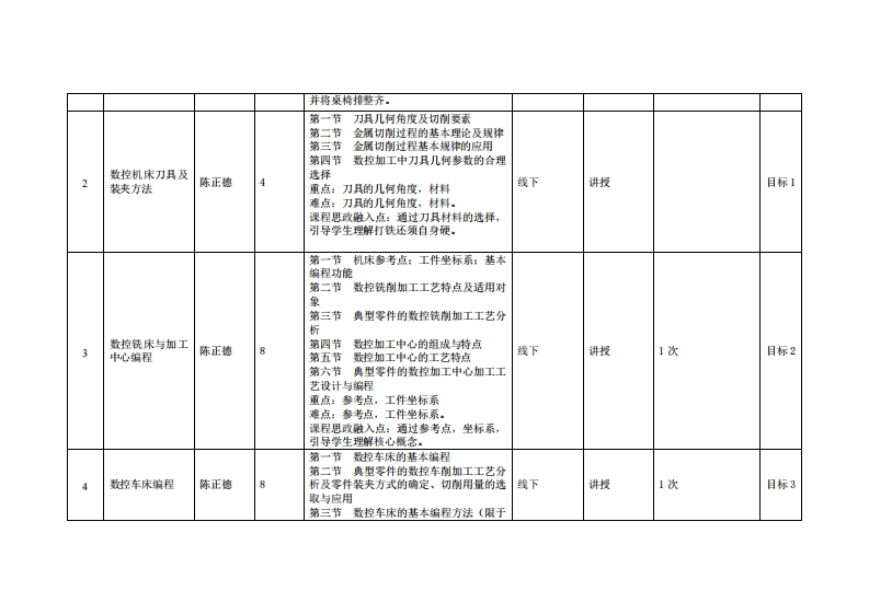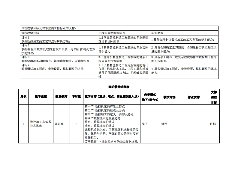 《数控加工与编程》教学大纲课斑名称:数拉加工与情定课类别(必修选修):选修课程英文名称:Numerical Control Manufacturing and Programming总学时周学时学分,322/2其中实检实减学时,8先修课塞:工程制图、金属材料及热处理、金属切削刀具后续课瘦支撑机械制造技术基础、机电一体化系统设计漫课时间:217周周四34节授课地点:教学楼2209提课对津:2021智能制造工程2班开裸学桃:粤台产业科技学院任课就师姓名称:陈正裤/讲师答鞭时间、地点与方式:课中课后、教学楼2209、面答/微信群课程考方式:开卷()闭卷()课程论文()其它()使用微村李体仁,第1版,北京大学出版社,2016年5月.妆学考查料:1.胡占齐杨莉主编,机械工业出版社,2023年1月·课程简介:《数控加工与编程》是一门实践性非常强的课程,通过本课程的学习,学生应掌握计算机数控技术的基本原理和基础知识,掌握数控系统和机械结构,培养学生编程和加工的能力。本课程主要包括程序编制的基础、常用编程指令及数学处理、数控车床的程序编制、数控铣床的程序编制、加工中心的程序编制、数控系统基本原理与结构、数控机床的同服系统、数控机床结构设计等内容。本课程的主要任务是训练学生数控编程和数控加工的能力,目的是培养学生的实践动手能力和创新能力。学习本课程的目的是使学生在短时间内掌握数控机床、数控编程及数控机床操作有关基本知识:并通过实验增加感性认识,提高学生的动手能力。本课程还通过先进的电教手段和网络化教学手段,为学生提供更多的信息。