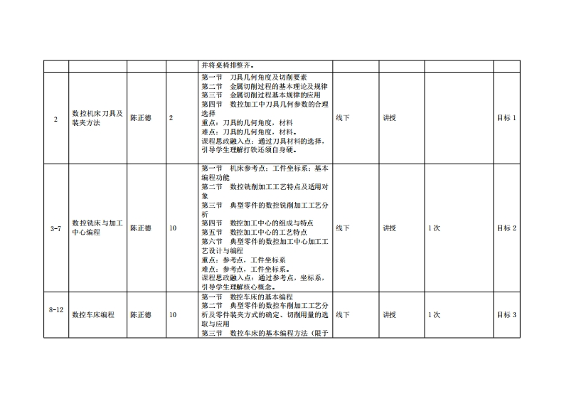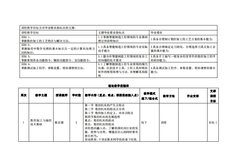 《数控珈工与编程》教学大纲裸程名称:数拉加工与铺程课程类别(必修选修)事选修课程英文名称:Numerical Control Manufacturing and Programming总学时周学时/学分,322/2其中实险实戒学时:8先熊课是:工程制图、金属材料及热处理、金属切削刀具后续课程支撑:机械制造技术基础、机电一体化系统设计授课时间:1-16周周二3-4节授课地点:教学楼6302提课对津:2023智能制造工程1班2班开课学洗:粤台产业科技学院任课敏即姓名/职淋:陈正德讲师答鞭时间、地点与方式:裸中课后、教学楼配11、面答/微信稀课程考核方式:开卷()闭卷()课程论文()其它(√)使用微材:数控加工与编程技术李体仁,第1版,北京大学出版社,2023年7月收学◆考资料:1.数控技术与编程应用(第2版)任重龙艳萍闫瑞涛主编,华中科技大学出版社,2022年6月。课程简介:《数控加工与编程》是一门实践性非常强的课程,通过本课程的学习,学生应掌握计算机数控技术的基本原理和基础知识,攀握数控系统和机械结构,培养学生编程和加工的能力。本课程主要包括程序编制的基础、常用编程指令及数学处理、数控车床的程序编制、数控铣床的程序编制、加工中心的程序编制、数控系统基本原理与结构、数控机床的问服系统、数控机床结构设计等内容。本课程的主要任务是训练学生数控编程和数控加工的能力,目的是培养学生的实践动手能力和创新能力。学习本课程的目的是使学生在短时间内攀握数控机床、数控编程及数控机床操作有关基本知识:并通过实验增加感性认识,提高学生的动手能力。本课程还通过先进的电教手段和网络化教学手段,为学生提供更多的信息