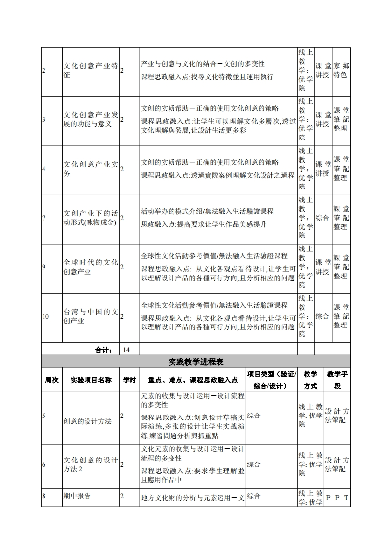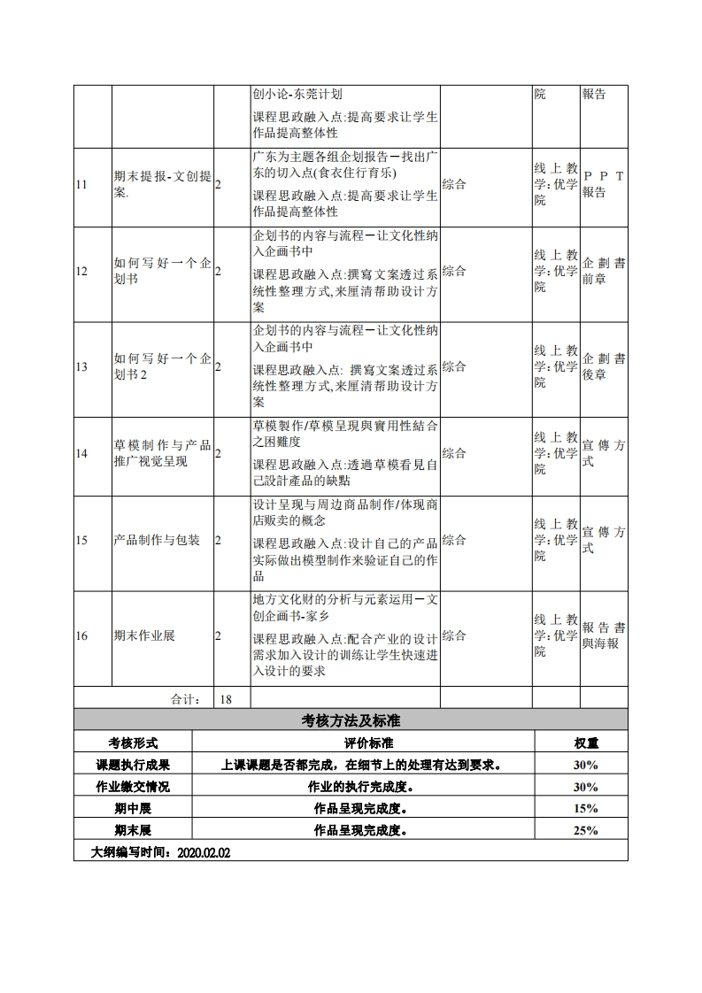 《文化创意概论》教学大纲课程名称:文化创意概论课程类别(必修选修):必修课程英文名称:Product Design1总学时/周学时/学分:32/2/2其中实验/实践学时:18先修课程:授课时间:授课地点:实验楼218授课对象:2018工业设计1班开课学院:粤台产业科技学院工业设计系任课教师姓名/职称:张鸿食答疑时间、地点与方式:课程考核方式:开卷()闭卷()课程论文()其它(v)使用教材:文化创意产业基础/卢海李玲/武汉大学出版社产教学参考资料::1产品设计(全国高等院校艺术设计专业“十三五”规划散材)/作者:陈文龙、沈元编着出版社:中国轻工业出版社/出版时间2017年07月2.产品设计(第2版中国高等院校艺术设计专业系列教材/王虹,沈杰,张展/出版社:上海人民美术出版社/出版时间:2006年01月课程简介:延伸设计与创意运用于文化的传递,让学生了解与实际操作文化元素在设计的策咯中课程教学目标本课程与学生核心能力培养之间A理解一创意产业的概述与应用文化的关联(授课对象为理工科专业B.运用一学会文化元素应用与设计加值学生的课程填写此栏):C综合一找到适合的创意体现于文化传递上。▣核心能力1.一、知识目标:■核心能力2.1文化元素患用的概念、方法、逻辑、结构及重要性;■核心能力3.2.文削产品设计的模式应用,交互应用与细项处理。口核心能力4.二、能力目标:口核心能力5.1.熟练产品设计概念建立,并且能够独立思考与解思:■核心能力6.2.分析判断与下决定的过的建立。口核心能力7.三、素质目标:口核心能力8.1.培养学生具有主动练习、持之以恒、认知产品设计的真实想法、探究设计态度和意识:理论教学进程表学时周次散学主题教学的重点、难点、课程思政融入点散半教学作业数方式手段安排线上文化是什么/文化推展的优与缺教文化创意概念2课程思政融入点:从文化各观点看待设计,让学生可学:课堂家鄉以理解设计产品的各種可行方向,且分析相应的问题优学讲授地圆院
