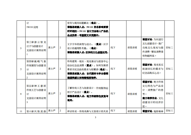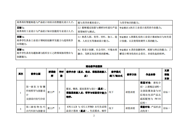 《文化创意设计》教学大纲课意名称:文化创意设计课泡类别(必懂选修)·任炸课程英文名称:Cultural Creative Design总学时周学时学分,322/2其中实检实减学时,16先修课程時顺狱设计、产品视型制作实务后续课程支撑:专测制作4、专题华业实习、毕业设计授课时间:周一1-2节1-16周)授课地点:实验楼218/机电楼310提课对津:2022饺工业设计开裸学瑰:粤合产业科妆学陕任课妆柳姓名淋:黄士严就战容鞭时间、地点与方式:实202周一第7节16:2517:10课避考核方式:开卷()闭卷()课程论文()其它()使用村《中国传统文化与创意设计》,别爱珍着,机械工业出版社,224年7月(十三五”职业妆青巴家机收村公共基础课“十三五”机划装村1SBN:978-7-111-604204妆学考资料:《文化创意与境划》,谢棒、王建着,清华大学出版社,2021年01月1SBN:9787302415077课程物介:传线文化融入产品设计,这将大大凸显产品的中回特色和民族风情,不仅可以使国内的消费者产生民族认同感,也符合中国产品国际化的需求,因为“民族的才是世的”,融入中回传统文化的产品设计更可以通过差异化的文化定位打行开国际市场。因此,所体现中华文化特色又能适应现代生活需要的产品,将受到中巴人的青珠,也将成为设计未来发晨的趋势。课程妆学目标及对毕业要求州标点的支排:课应妆学目标支撑单业要求指标点华业要求目标1:13具备设计美学的原理知识,打造功毕业要求1熟练运用设计基础知识,智能制造知识