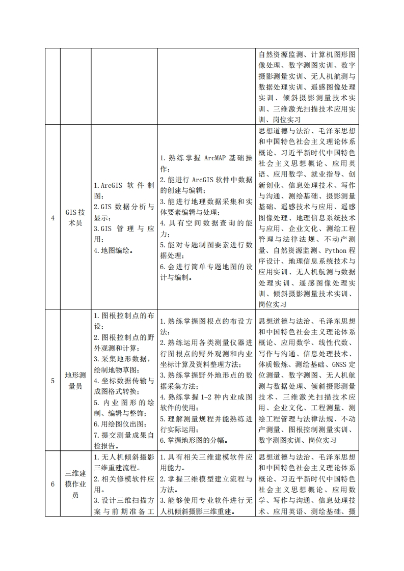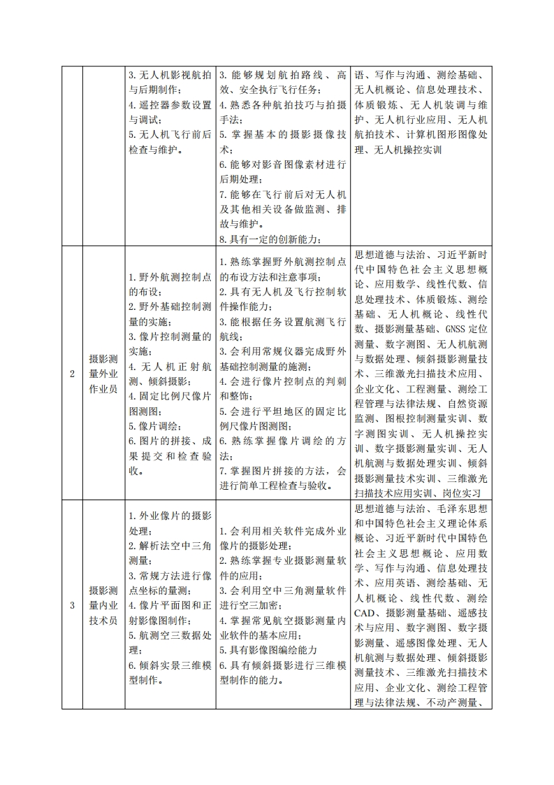 《无人机测绘技术》专业人才培养方案一、专业名称及代码专业名称:无人机测绘技术专业代码:420307二、入学要求招生对象:高中(中职)毕业生或具有同等学力者。招生类型:文理兼收。三、修业年限三年。四、职业面向(一)职业能力分析1.专业服务面向毕业生主要在基础测绘、国土资源、城市规划、环境保护、交通运输、农林监测、电力、植保、公安、应急测绘等行业从无人机测绘数据采集与地理信息产品生产、协助各个行业开展建设、服务和管理第一线需要高素质技术技能人才。在无人机装调检修、无人机销售公司从事无人机的检修维护、销售和技术培训等工作。在影视航拍、新闻媒体、农业植保、电力巡检、高速巡警、灾害救援等领域从事无人机飞手,协助各行业利用无人机获取目标数据。毕业后的就业岗位主要有:无人机航测数据采集员、摄影测量外业作业员、摄影测量内业技术员、无人机驾驶员、无人机装调检修工、无人机销售与培训人员等工作岗位。就业前景:随着低空经济的发展,无人机民用化、商业化进程的不断推进,无人机在各行各业的应用越来越广泛,尤其是无人机测绘技术和新型遥感平台的逐渐成熟,多种传感器之间的集成与数据融合,地理信息的快速获取和更新,国家提出了新型基础测绘、应急测绘、航空航天遥感测绘、全球地理信息资源建设协同发展的新目标,无人机测绘技术已成为引领测绘行业发展的主要动力和方向。这些都为无人机测绘技术专业的发展创造了重大的机遇,这也势必导致需要大量的无人机测绘技术人才。2.职业岗位与职业能力分析序工作典型工作任务职业能力支撑课程号岗位1.根据不同任务选1.熟悉常用款无人机的各项思想道德与法治、毛泽东思想无人机择适配的无人机:功能与技术参数:和中国特色社会主义理论体系1驾驶员2.无人机手控飞2.能掌握航拍无人机的平稳概论、习近平新时代中国特色行:操控:社会主义思想概论、应用英