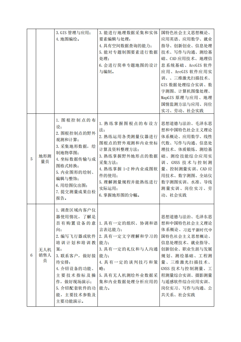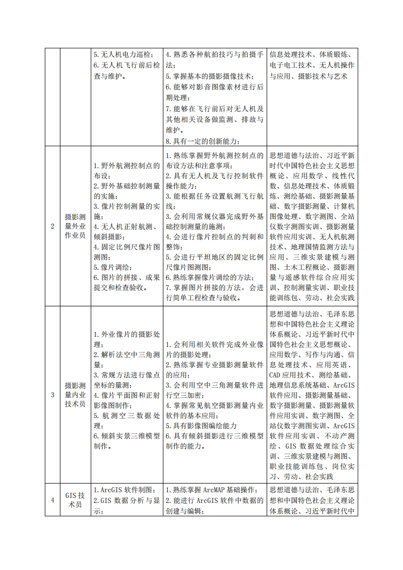 《无人机测绘技术》专业人才培养方案一、专业名称及代码专业名称:无人机测绘技术专业代码:420307二、入学要求招生对象:高中(中职)毕业生或具有同等学力者。招生类型:文理兼收。三、修业年限三年。四、职业面向(一)职业能力分析1.专业服务面向毕业生主要在在无人机装调检修、无人机销售公司从事无人机的检修维护、销售和技术培训等工作。在基础测绘、国土资源、城市规划、环境保护、交通运输、农林监测、电力、植保、公安、应急测绘等行业从无人机测绘数据采集与地理信息产品生产、协助各个行业开展建设、服务和管理第一线需要高素质技术技能人才。在影视航拍、新闻媒体、农业植保、电力巡检、高速巡警、灾害救援等领域从事无人机飞手,协助各行业利用无人机获取目标数据。毕业后的就业岗位主要有:无人机航测数据采集员、摄影测量外业作业员、摄影测量内业技术员、无人机驾驶员、无人机装调检修工、无人机销售与培训人员等工作岗位。就业前景:随着无人机民用化、商业化进程的不断推进,无人机在各行各业的应用越来越广泛,尤其是无人机测绘技术和新型遥感平台的逐渐成熟,多种传感器之间的集成与数据融合,地理信息的快速获取和更新,国家提出了新型基础测绘、应急测绘、航空航天遥感测绘、全球地理信息资源建设协同发展的新目标,无人机测绘技术已成为引领测绘行业发展的主要动力和方向。这些都为无人机测绘技术专业的发展创造了重大的机遇,这也势必导致需要大量的无人机测绘技术人才。2.职业岗位与职业能力分析序工作号岗位典型工作任务职业能力支撑课程1.根据不同任务选择1.熟悉常用款无人机的各项功思想道德与法治、毛泽东思适配的无人机:能与技术参数:想和中国特色社会主义理论无人机2.无人机手控飞行:2.能掌握航拍无人机的平稳操体系概论、习近平新时代中1驾驶员3.无人机影视航拍与控:国特色社会主义思想概论、后期制作:3.能够规划航拍路线、高效、应用英语、写作与沟通、4.无人机植保:安全执行飞行任务:CAD应用技术、线性代数、