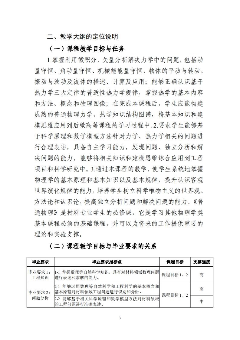 《普通物理I》课程教学大纲一、课程概况课程名称普通物理1课程号1412053课程英文名称General Physics I学时/学分72/4材料化学、材料物理、功课程性质必修适用专业能材料、新能源材料与器承课程负责人祁菁教学团队温娟徐奇选用教材:《物理学》(第五版)(上卷)刘克哲高等教育出版社:选用教材及参考书目:《普通物理学》(第五版)程守洙高等教育出版社:费曼物理学讲义上参考书目海科学技术出版社:新概念物理教程赵凯华等编著《力学》《电磁学》(2004年第二版)高等教育出版社。课程简介:物理学是研究宏观与微观世界物体运动规律的科学。物理学所研究的是最基本最普遍的运动,它包括机械运动、分子热运动、电磁运动、原子和原子核内部的运动等等。它的研究目的在于认识揭示物质的不同层次的内部结构、物质运动之间的相互转化和相互作用以及运动形态的基本性质和规律,可以认为物理学是除了数学以外的一切自然科学的基础。物理学是高等学校理工科各专业学生的一门重要的必修基础课,其基本概念、基本理论和基本方法是构成学生科学素养的重要组成部分。《普通物理12》主要讲述力学和热力学统计两部分内容,力学包括物体的平动与转动、振动与波动及流体的描述、计算及应用,热力学包括系统卡诺循环、理想气体的热力学过程、平衡的自由能和自由焓判据、计算及应用。课程目标(Course Objectives,CO)掌握利用微积分、矢量分析解决力学中的问题,包括动量守恒、角动量守恒、机械能能量守恒,物体的平动与转动、振动与波动及流知识目标(C01)体的描述、计算及应用:能够正确认识基于热力学三大定律的普适性热力学规律,掌握热学的基本内容和方法、概念和物理图像:在完成本课程后,学生应能构建成熟的普通物理力学、热学知识结构图谱,将基本知识和建模思维应用到后续高等课程的学习过程中。要求学生能够基于科学原理和数学模型方法针对力学、热力学相关能力目标(C02)的问题进行合理表述,具备自主学习能力,发现问题、独立分析和解决问题的能力,能够将相关知识和建模思维综合应用到工程项目和科学研究中。通过本课程的教学,使学生系统地掌握物理学的基本原理和基本知识以及基本规律,提升认识客观世界演化规律的能力,培养学生树素质、情感价值观目标(CO3)立科学唯物主义的世界观、方法论和认识论,提高独立分析问题和解决问题的能力。《普通物理》是材料专业学生的必修课,它是学习其他物理学类基本课程必须的基础课程,并可以为将来的工作提供重要的理论和实验支撑。教学方式(Pedagogical☑PM1讲授法教学60学时83%☑PM2研讨式学习12学时17%Methods,PM)